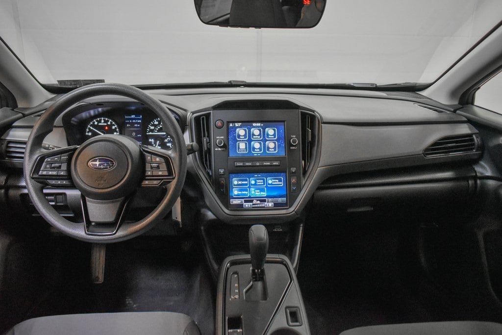 This Crosstrek is well equipped with Popular Package #1A (Auto-Dimming Mirror w/Compass & HomeLink, Cargo Tray, and Rear Bumper Cover), Standard Model, 3.90 Axle Ratio, 4 Speakers, 4-Wheel Disc Brakes, ABS brakes, Air Conditioning, Alloy wheels, AM/FM radio: SiriusXM, Anti-whiplash front head restraints, Auto High-beam Headlights, Automatic temperature control, Brake assist, Bumpers: body-color, Cloth Upholstery, Driver door bin, Driver vanity mirror, Dual front impact airbags, Dual front side impact airbags, Electronic Stability Control, Exterior Parking Camera Rear, Four wheel independent suspension, Front anti-roll bar, Front Bucket Seats, Front Center Armrest, Front dual zone A/C, Front reading lights, Fully automatic headlights, Illuminated entry, Knee airbag, Low tire pressure warning, Occupant sensing airbag, Outside temperature display, Overhead airbag, Overhead console, Panic alarm, Passenger door bin, Passenger vanity mirror, Power door mirrors, Power steering, Power windows, Radio data system, Radio: Subaru STARLINK Dual 7.0" Multimedia System, Rear anti-roll bar, Rear window defroster, Rear window wiper, Remote keyless entry, Security system, Speed control, Speed-sensing steering, Split folding rear seat, Spoiler, STARLINK/Apple CarPlay/Android Auto, Steering wheel mounted audio controls, Tachometer, Telescoping steering wheel, Tilt steering wheel, Traction control, Trip computer, Variably intermittent wipers, and Wheels: 17" x 7.0J Dark Gray Aluminum Alloy.