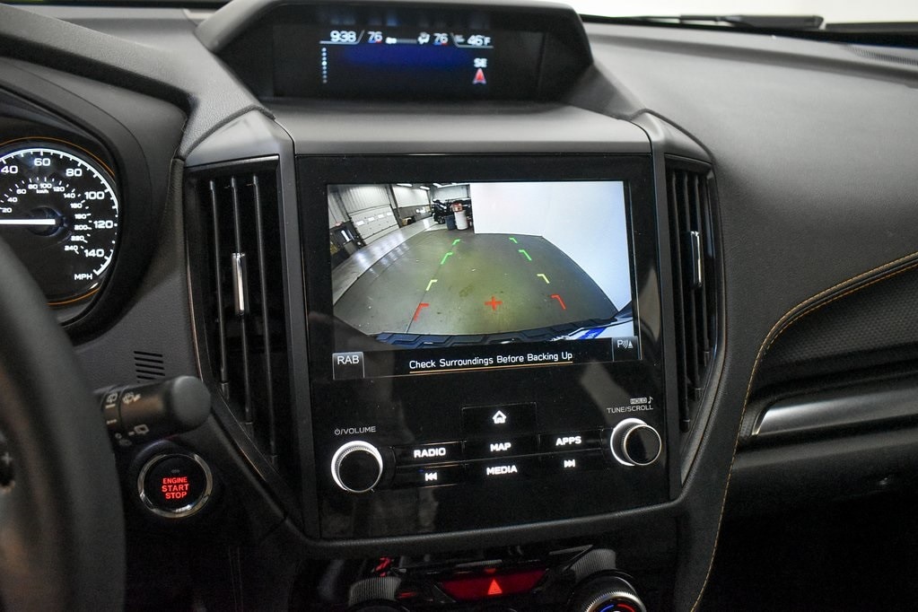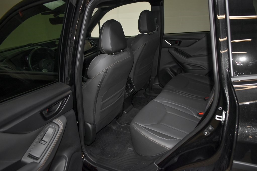 This Forester is well equipped with harman/kardon Audio & Power Rear Gate (Power Rear Gate and Radio: Subaru 8.0" Multimedia Navigation System), 4-Wheel Disc Brakes, 6 Speakers, ABS brakes, Air Conditioning, Alloy wheels, AM/FM radio: SiriusXM, Anti-whiplash front head restraints, Auto High-beam Headlights, Auto-Dimming Mirror w/Compass & HomeLink, Automatic temperature control, Brake assist, Bumpers: body-color, Cargo Net, Cargo Sidewall Protector, Driver door bin, Driver vanity mirror, Dual front impact airbags, Dual front side impact airbags, Electronic Stability Control, Emergency communication system: MySubaru Safety (3-year free trial), Exterior Parking Camera Rear, Four wheel independent suspension, Front anti-roll bar, Front Bucket Seats, Front Center Armrest, Front dual zone A/C, Front fog lights, Front reading lights, Fully automatic headlights, Heated door mirrors, Heated Front Bucket Seats, Heated front seats, Illuminated entry, Knee airbag, Leather Shift Knob, Leather steering wheel, LED Upgrade, Low tire pressure warning, Occupant sensing airbag, Outside temperature display, Overhead airbag, Overhead console, Panic alarm, Passenger door bin, Passenger vanity mirror, Power door mirrors, Power driver seat, Power moonroof: Panoramic, Power steering, Power windows, Radio data system, Radio: Subaru 8.0" Multimedia Plus System, Rear anti-roll bar, Rear Bumper Cover, Rear seat center armrest, Rear window defroster, Rear window wiper, Remote keyless entry, Security system, Speed control, Speed-sensing steering, Splash Guards - Wilderness, Split folding rear seat, Spoiler, Steering wheel mounted audio controls, Tachometer, Telescoping steering wheel, Textured StarTex Upholstery, Tilt steering wheel, Traction control, Trip computer, Turn signal indicator mirrors, Variably intermittent wipers, and Wheels: 17" x 7.0 J Matte Black Finish Alum-Alloy.