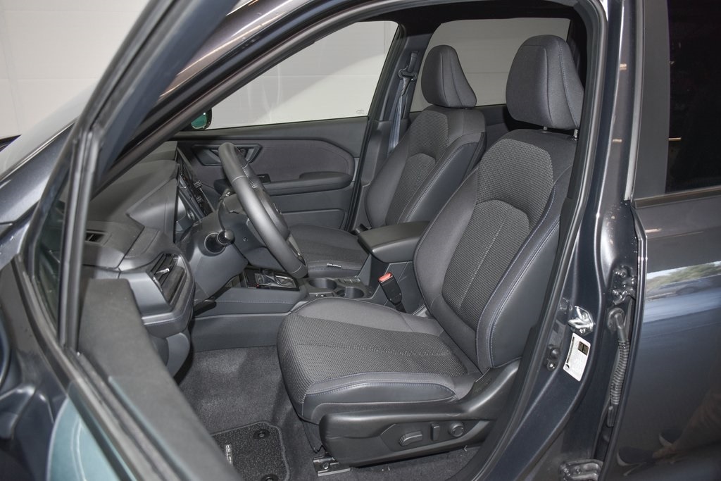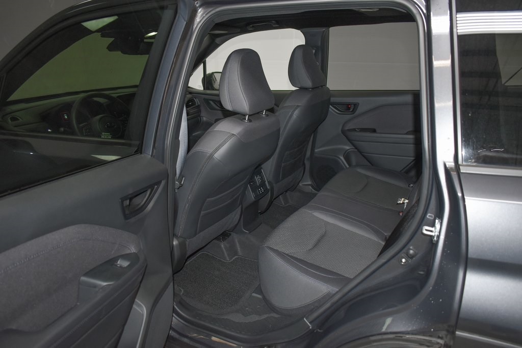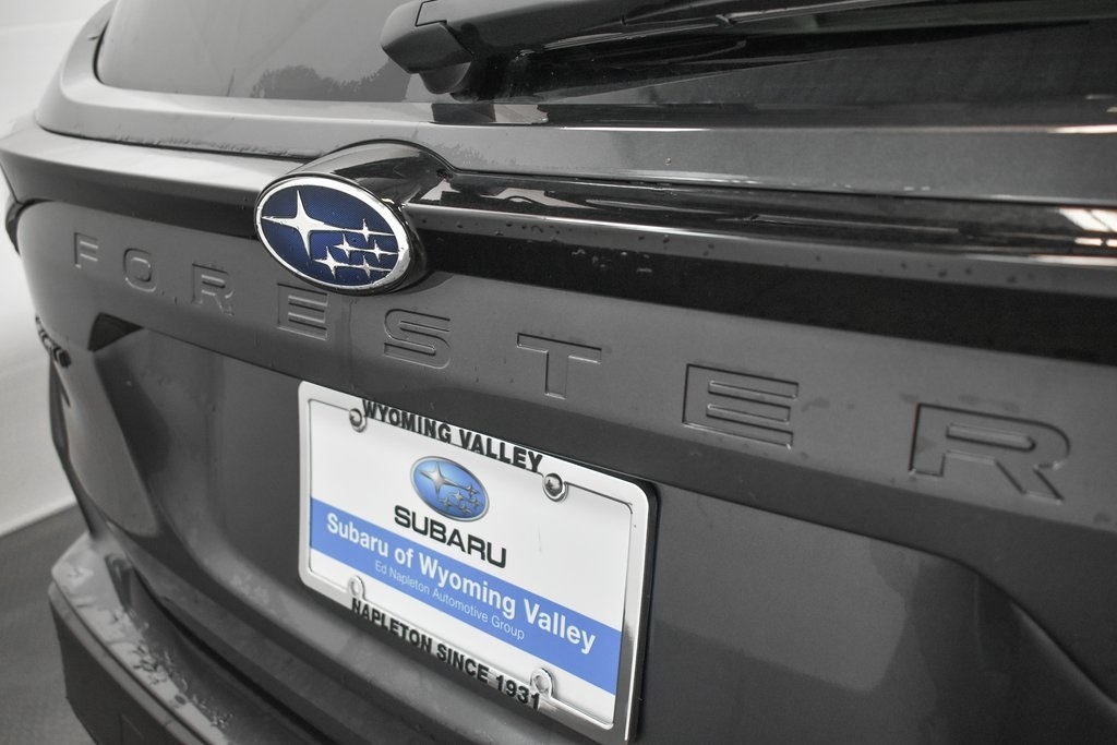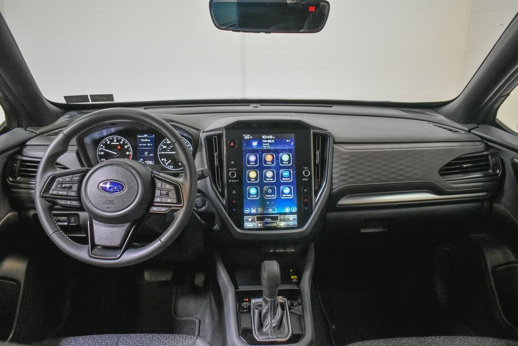This Forester is well equipped with Power Rear Gate & Blind Spot Detection w/RCTA (Automatic Emergency Steering, Blind-Spot Detection (BSD)/RCTA System, and Power Rear Gate), 4-Wheel Disc Brakes, 6 Speakers, ABS brakes, Air Conditioning, Alloy wheels, AM/FM radio: SiriusXM with 360L, Anti-whiplash front head restraints, Auto High-beam Headlights, Auto-Dimming Exterior Mirror w/Approach Light, Auto-Dimming Mirror w/Compass & HomeLink, Automatic temperature control, Brake assist, Bumpers: body-color, Cargo Net, Driver door bin, Driver vanity mirror, Dual front impact airbags, Dual front side impact airbags, Electronic Stability Control, Emergency communication system: MySubaru Safety (3-year free trial), Exterior Parking Camera Rear, Four wheel independent suspension, Front anti-roll bar, Front Bucket Seats, Front Center Armrest, Front dual zone A/C, Front fog lights, Front reading lights, Fully automatic headlights, Heated door mirrors, Heated Front Bucket Seats, Heated front seats, Illuminated entry, Knee airbag, Leather steering wheel, Low tire pressure warning, Occupant sensing airbag, Outside temperature display, Overhead airbag, Overhead console, Panic alarm, Passenger door bin, Passenger vanity mirror, Power door mirrors, Power driver seat, Power moonroof: Panoramic, Power steering, Power windows, Premium Textured Cloth Upholstery, Radio data system, Radio: Subaru 11.6" Multimedia Plus System, Rear anti-roll bar, Rear seat center armrest, Rear window defroster, Rear window wiper, Remote keyless entry, Security system, Speed control, Speed-sensing steering, Splash Guards, Split folding rear seat, Spoiler, Steering wheel mounted audio controls, Tachometer, Telescoping steering wheel, Tilt steering wheel, Traction control, Trip computer, Variably intermittent wipers, and Wheels: 17" x 7.0 J Dark Metallic Aluminum-Alloy.