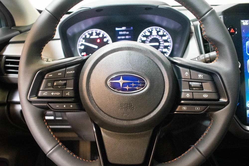 This Crosstrek is well equipped with 4-Wheel Disc Brakes, 6 Speakers, ABS brakes, Air Conditioning, Alloy wheels, AM/FM radio: SiriusXM, Anti-whiplash front head restraints, Auto High-beam Headlights, Automatic temperature control, Brake assist, Bumpers: body-color, Driver door bin, Driver vanity mirror, Dual front impact airbags, Dual front side impact airbags, Electronic Stability Control, Emergency communication system, Exterior Parking Camera Rear, Four wheel independent suspension, Front anti-roll bar, Front Bucket Seats, Front Center Armrest, Front dual zone A/C, Front fog lights, Front reading lights, Fully automatic headlights, Heated door mirrors, Heated Front Bucket Seats, Heated front seats, Illuminated entry, Knee airbag, Leather Shift Knob, Leather steering wheel, Leather-Trimmed Upholstery, Low tire pressure warning, Occupant sensing airbag, Outside temperature display, Overhead airbag, Overhead console, Panic alarm, Passenger door bin, Passenger vanity mirror, Power door mirrors, Power driver seat, Power steering, Power windows, Radio data system, Radio: Subaru 11.6" Multimedia Plus System, Rear anti-roll bar, Rear seat center armrest, Rear window defroster, Rear window wiper, Remote keyless entry, Security system, Speed control, Speed-sensing steering, Split folding rear seat, Spoiler, Steering wheel mounted audio controls, Tachometer, Telescoping steering wheel, Tilt steering wheel, Traction control, Trip computer, Turn signal indicator mirrors, Variably intermittent wipers, and Wheels: 18" x 7.0" J Machine Finish Aluminum-Alloy.