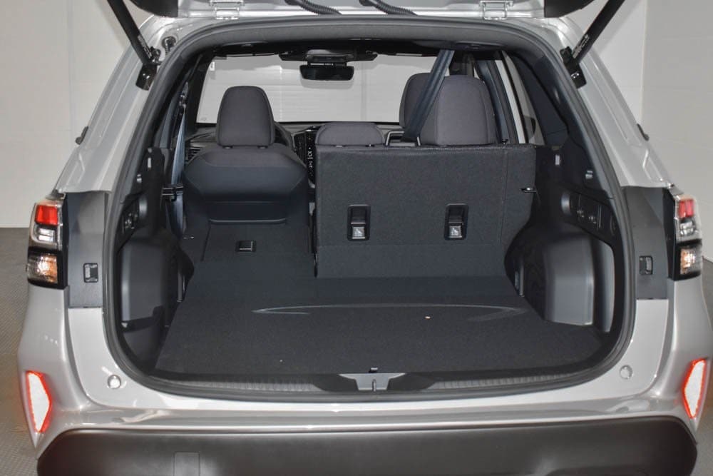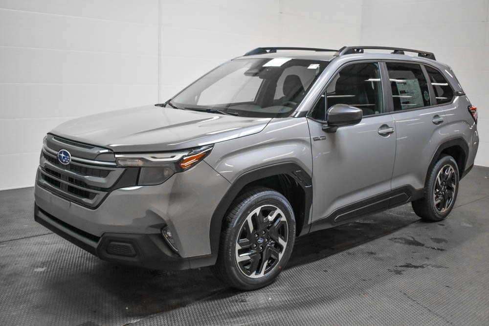 This Forester Hybrid is well equipped with Standard Model, 4-Wheel Disc Brakes, 6 Speakers, ABS brakes, Air Conditioning, Alloy wheels, AM/FM radio: SiriusXM with 360L, Anti-whiplash front head restraints, Auto High-beam Headlights, Automatic temperature control, Brake assist, Bumpers: body-color, Compass, Driver door bin, Driver vanity mirror, Dual front impact airbags, Dual front side impact airbags, Electronic Stability Control, Emergency communication system: MySubaru Safety (3-year free trial), Exterior Parking Camera Rear, Four wheel independent suspension, Front anti-roll bar, Front Bucket Seats, Front Center Armrest, Front dual zone A/C, Front fog lights, Front reading lights, Fully automatic headlights, Heated door mirrors, Heated Front Bucket Seats, Heated front seats, Illuminated entry, Knee airbag, Low tire pressure warning, Navigation system: TomTom Navigation w/what3words, Occupant sensing airbag, Outside temperature display, Overhead airbag, Overhead console, Panic alarm, Passenger door bin, Passenger vanity mirror, Power door mirrors, Power driver seat, Power Liftgate, Power moonroof: Panoramic, Power steering, Power windows, Premium Cloth Upholstery, Radio data system, Radio: Subaru 11.6" Multimedia Navigation System, Rear anti-roll bar, Rear seat center armrest, Rear window defroster, Rear window wiper, Remote keyless entry, Security system, Speed control, Speed-sensing steering, Split folding rear seat, Spoiler, Steering wheel mounted audio controls, Tachometer, Telescoping steering wheel, Tilt steering wheel, Traction control, Trip computer, Variably intermittent wipers, and Wheels: 18" x 7.0 J Dark Metallic Aluminum-Alloy.