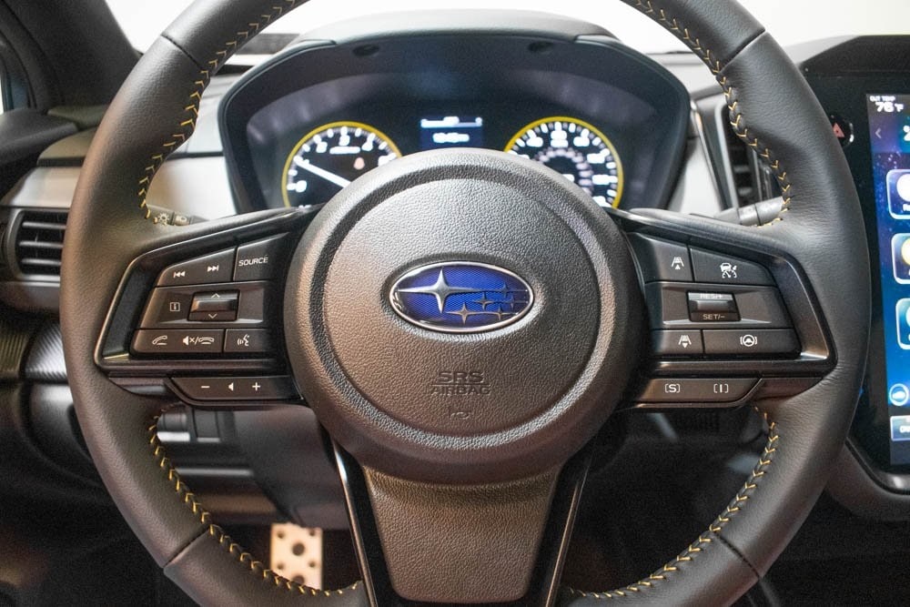 This Crosstrek is well equipped with 4-Wheel Disc Brakes, 6 Speakers, ABS brakes, Air Conditioning, Alloy wheels, AM/FM radio: SiriusXM, Anti-whiplash front head restraints, Auto High-beam Headlights, Automatic temperature control, Brake assist, Bumpers: body-color, Driver door bin, Driver vanity mirror, Dual front impact airbags, Dual front side impact airbags, Electronic Stability Control, Emergency communication system: MySubaru Companion (5-years free), Exterior Parking Camera Rear, Four wheel independent suspension, Front anti-roll bar, Front Bucket Seats, Front Center Armrest, Front dual zone A/C, Front fog lights, Front reading lights, Fully automatic headlights, Heated door mirrors, Heated Front Bucket Seats, Heated front seats, Illuminated entry, Knee airbag, Leather Shift Knob, Leather steering wheel, Low tire pressure warning, Occupant sensing airbag, Outside temperature display, Overhead airbag, Overhead console, Panic alarm, Passenger door bin, Passenger vanity mirror, Power door mirrors, Power steering, Power windows, Radio data system, Radio: Subaru 11.6" Multimedia Plus System, Rear anti-roll bar, Rear seat center armrest, Rear side impact airbag, Rear window defroster, Rear window wiper, Remote keyless entry, Security system, Speed control, Speed-sensing steering, Split folding rear seat, Spoiler, Sport Cloth Upholstery, Steering wheel mounted audio controls, Tachometer, Telescoping steering wheel, Tilt steering wheel, Traction control, Trip computer, Turn signal indicator mirrors, Variably intermittent wipers, and Wheels: 18" x 7.0" J Dark Gray Aluminum-Alloy.