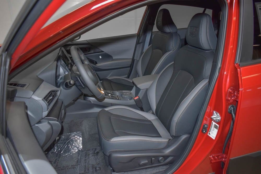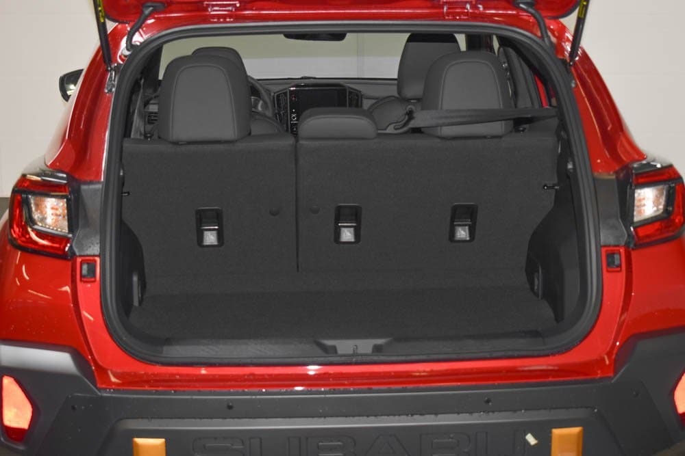 This Crosstrek is well equipped with 4-Wheel Disc Brakes, 6 Speakers, ABS brakes, Air Conditioning, Alloy wheels, AM/FM radio: SiriusXM, Anti-whiplash front head restraints, Auto High-beam Headlights, Automatic temperature control, Brake assist, Bumpers: body-color, Driver door bin, Driver vanity mirror, Dual front impact airbags, Dual front side impact airbags, Electronic Stability Control, Emergency communication system: MySubaru Companion (5-years free), Exterior Parking Camera Rear, Four wheel independent suspension, Front anti-roll bar, Front Bucket Seats, Front Center Armrest, Front dual zone A/C, Front fog lights, Front reading lights, Fully automatic headlights, Heated door mirrors, Heated Front Bucket Seats, Heated front seats, Heated steering wheel, Illuminated entry, Knee airbag, Leather Shift Knob, Leather steering wheel, Low tire pressure warning, Occupant sensing airbag, Outside temperature display, Overhead airbag, Overhead console, Panic alarm, Passenger door bin, Passenger vanity mirror, Power door mirrors, Power steering, Power windows, Radio data system, Radio: Subaru 11.6" Multimedia Plus System, Rear anti-roll bar, Rear seat center armrest, Rear side impact airbag, Rear window defroster, Rear window wiper, Remote keyless entry, Security system, Speed control, Speed-sensing steering, Split folding rear seat, Spoiler, Steering wheel mounted audio controls, Tachometer, Telescoping steering wheel, Tilt steering wheel, Traction control, Trip computer, Turn signal indicator mirrors, Variably intermittent wipers, Wheels: 17" x 7.0" J Matte Black Aluminum-Alloy, and Wilderness StarTex Upholstery.