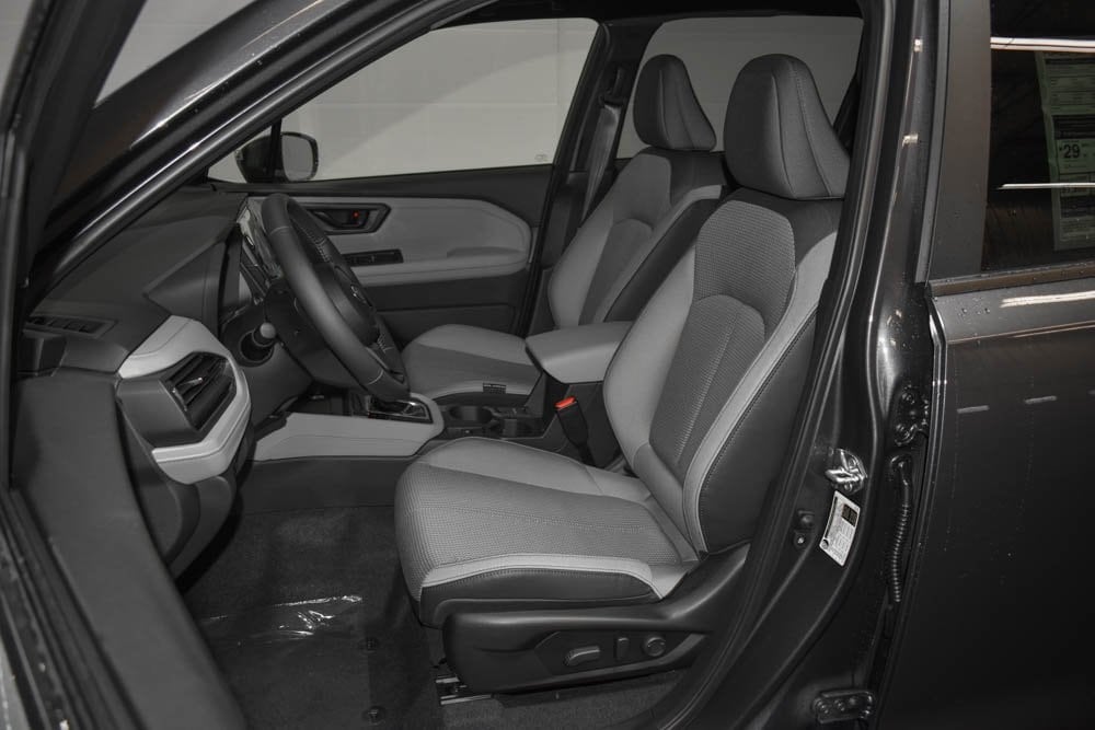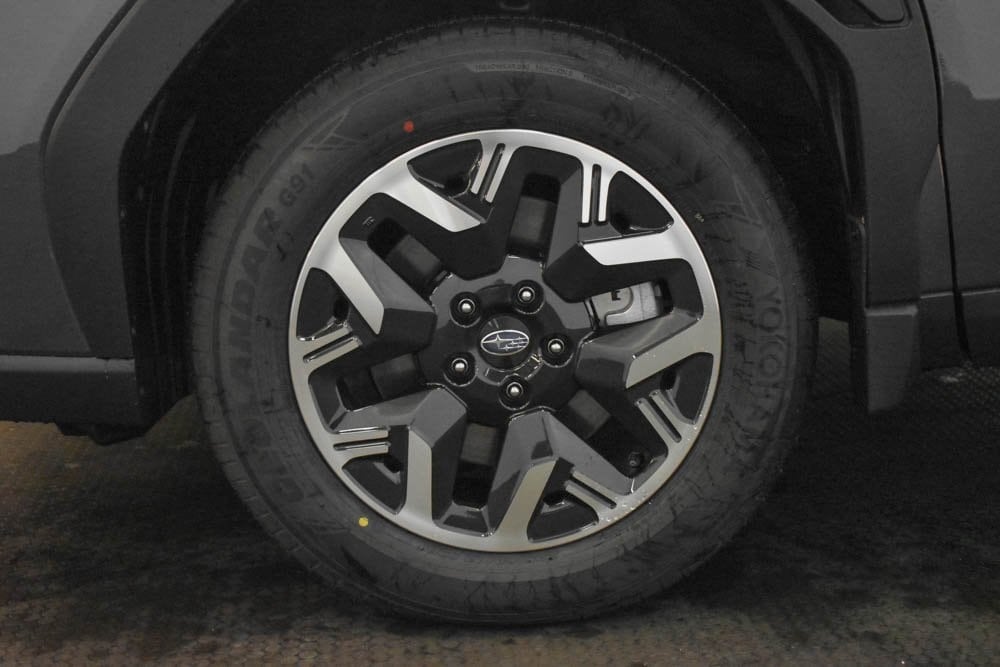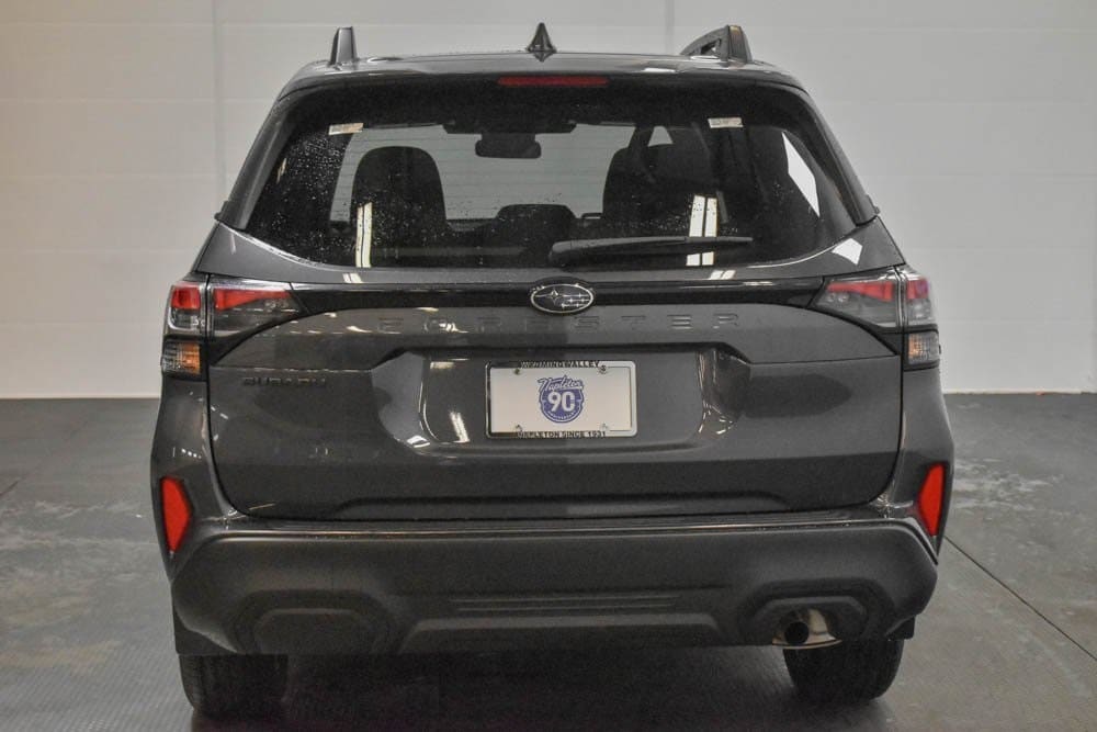 This Forester is well equipped with Standard Model, 4-Wheel Disc Brakes, 6 Speakers, ABS brakes, Air Conditioning, Alloy wheels, AM/FM radio: SiriusXM with 360L, Anti-whiplash front head restraints, Auto High-beam Headlights, Auto-Dimming Exterior Mirror with Approach Light, Auto-Dimming Mirror with Compass and HomeLink, Automatic temperature control, Brake assist, Bumpers: body-color, Driver door bin, Driver vanity mirror, Dual front impact airbags, Dual front side impact airbags, Electronic Stability Control, Emergency communication system: MySubaru Companion (5-years free), Exterior Parking Camera Rear, Four wheel independent suspension, Front anti-roll bar, Front Bucket Seats, Front Center Armrest, Front dual zone A/C, Front fog lights, Front reading lights, Fully automatic headlights, Heated door mirrors, Heated Front Bucket Seats, Heated front seats, Illuminated entry, Knee airbag, Leather steering wheel, Low tire pressure warning, Occupant sensing airbag, Outside temperature display, Overhead airbag, Overhead console, Panic alarm, Passenger door bin, Passenger vanity mirror, Power door mirrors, Power driver seat, Power moonroof: Panoramic, Power steering, Power windows, Premium Textured Cloth Upholstery, Radio data system, Radio: Subaru 11.6" Multimedia Plus System, Rear anti-roll bar, Rear Bumper Cover, Rear seat center armrest, Rear window defroster, Rear window wiper, Remote keyless entry, Security system, Speed control, Speed-sensing steering, Split folding rear seat, Spoiler, Steering wheel mounted audio controls, Tachometer, Telescoping steering wheel, Tilt steering wheel, Traction control, Trip computer, Variably intermittent wipers, and Wheels: 17" x 7.0 J Dark Metallic Aluminum-Alloy.