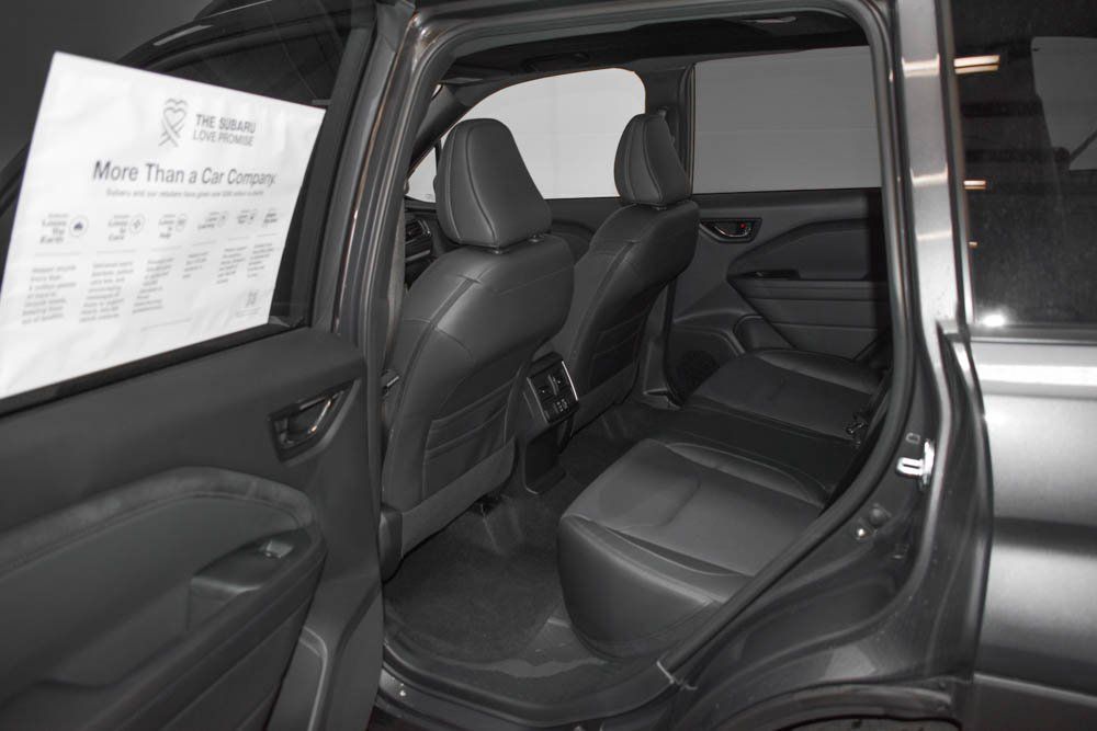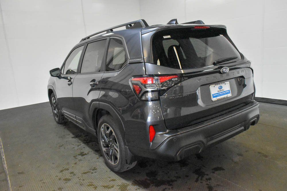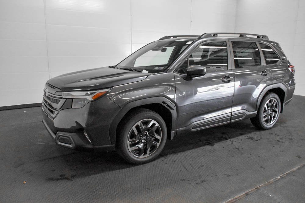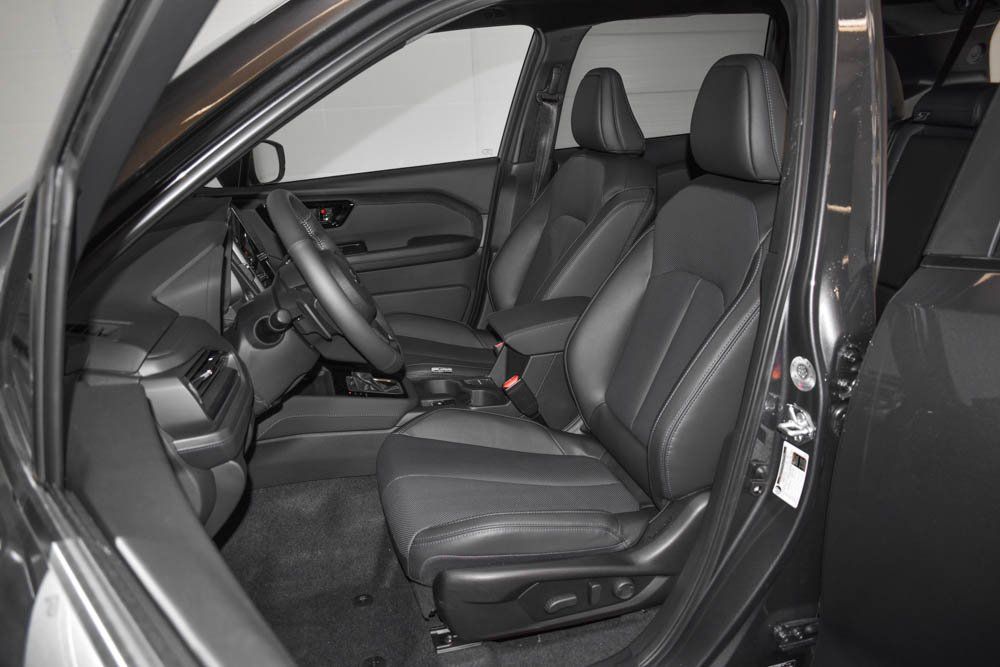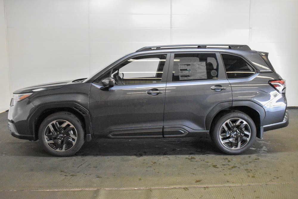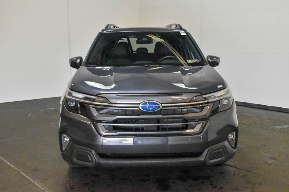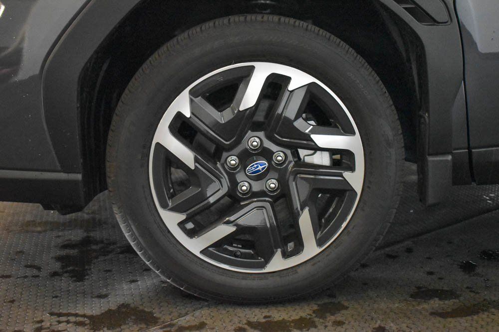 This Forester is well equipped with 4-Wheel Disc Brakes, 6 Speakers, ABS brakes, Air Conditioning, Alloy wheels, AM/FM radio: SiriusXM with 360L, Anti-whiplash front head restraints, Auto High-beam Headlights, Automatic temperature control, Brake assist, Bumpers: body-color, Driver door bin, Driver vanity mirror, Dual front impact airbags, Dual front side impact airbags, Electronic Stability Control, Emergency communication system: MySubaru Companion (5-years free), Exterior Parking Camera Rear, Four wheel independent suspension, Front anti-roll bar, Front Bucket Seats, Front Center Armrest, Front dual zone A/C, Front fog lights, Front reading lights, Fully automatic headlights, Heated door mirrors, Heated Front Bucket Seats, Heated front seats, Heated steering wheel, Illuminated entry, Knee airbag, Leather steering wheel, Low tire pressure warning, Occupant sensing airbag, Outside temperature display, Overhead airbag, Overhead console, Panic alarm, Passenger door bin, Passenger vanity mirror, Perforated Leather-Trimmed Upholstery, Power door mirrors, Power driver seat, Power Liftgate, Power moonroof: Panoramic, Power passenger seat, Power steering, Power windows, Radio data system, Radio: Subaru 11.6" Multimedia Plus System, Rain sensing wipers, Rear anti-roll bar, Rear seat center armrest, Rear window defroster, Rear window wiper, Remote keyless entry, Security system, Speed control, Speed-sensing steering, Split folding rear seat, Spoiler, Steering wheel mounted audio controls, Tachometer, Telescoping steering wheel, Tilt steering wheel, Traction control, Trip computer, Turn signal indicator mirrors, Variably intermittent wipers, and Wheels: 18" x 7.0 J Dark Metallic Aluminum-Alloy.