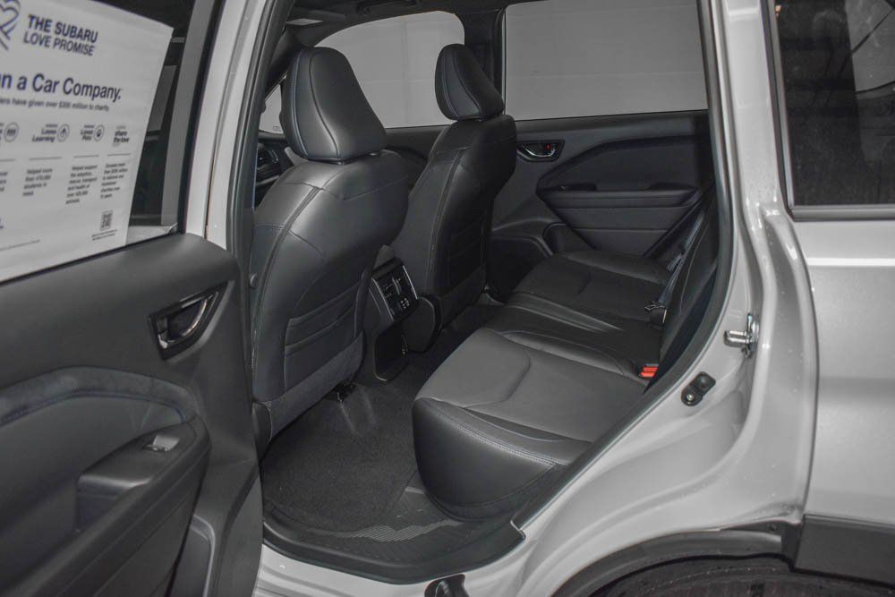 This Forester is well equipped with 4-Wheel Disc Brakes, 6 Speakers, ABS brakes, Air Conditioning, Alloy wheels, AM/FM radio: SiriusXM with 360L, Anti-whiplash front head restraints, Auto High-beam Headlights, Automatic temperature control, Brake assist, Bumpers: body-color, Driver door bin, Driver vanity mirror, Dual front impact airbags, Dual front side impact airbags, Electronic Stability Control, Emergency communication system: MySubaru Companion (5-years free), Exterior Parking Camera Rear, Four wheel independent suspension, Front anti-roll bar, Front Bucket Seats, Front Center Armrest, Front dual zone A/C, Front fog lights, Front reading lights, Fully automatic headlights, Heated door mirrors, Heated Front Bucket Seats, Heated front seats, Heated steering wheel, Illuminated entry, Knee airbag, Leather steering wheel, Low tire pressure warning, Occupant sensing airbag, Outside temperature display, Overhead airbag, Overhead console, Panic alarm, Passenger door bin, Passenger vanity mirror, Perforated Leather-Trimmed Upholstery, Power door mirrors, Power driver seat, Power Liftgate, Power moonroof: Panoramic, Power passenger seat, Power steering, Power windows, Radio data system, Radio: Subaru 11.6" Multimedia Plus System, Rain sensing wipers, Rear anti-roll bar, Rear seat center armrest, Rear window defroster, Rear window wiper, Remote keyless entry, Security system, Speed control, Speed-sensing steering, Split folding rear seat, Spoiler, Steering wheel mounted audio controls, Tachometer, Telescoping steering wheel, Tilt steering wheel, Traction control, Trip computer, Turn signal indicator mirrors, Variably intermittent wipers, and Wheels: 18" x 7.0 J Dark Metallic Aluminum-Alloy.