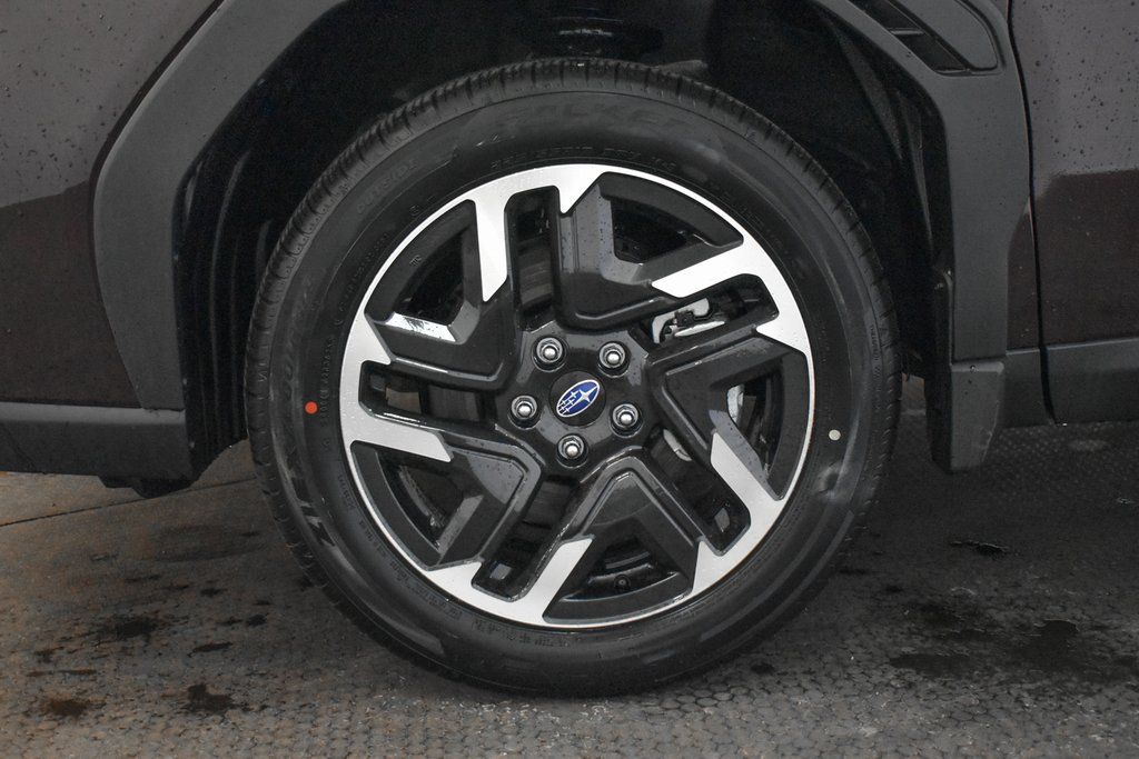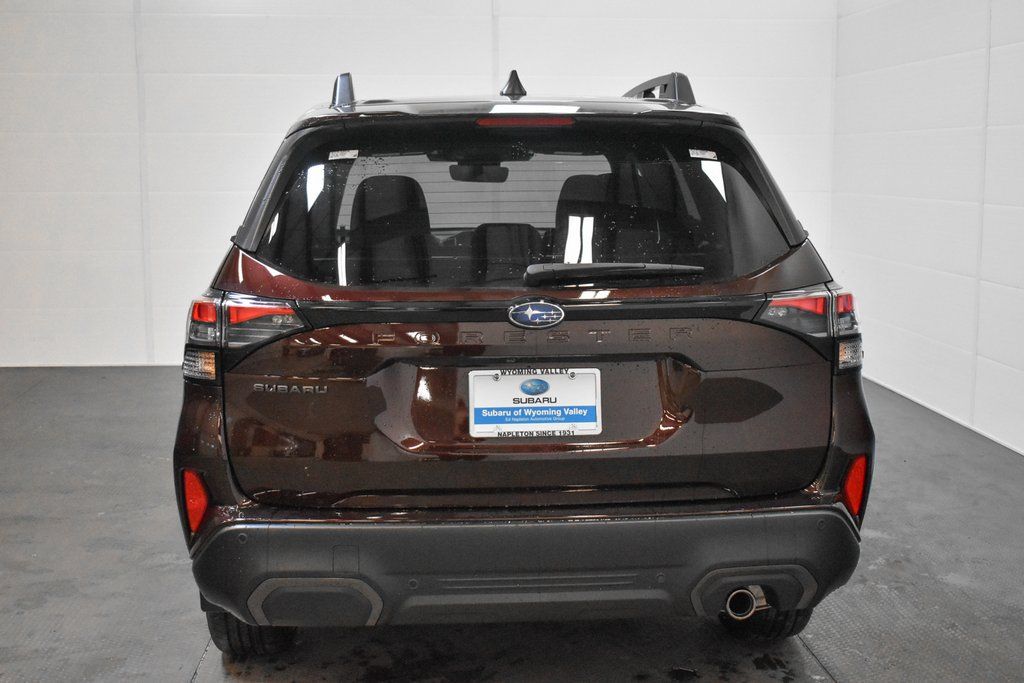 This Forester is well equipped with 4-Wheel Disc Brakes, 6 Speakers, ABS brakes, Air Conditioning, Alloy wheels, AM/FM radio: SiriusXM with 360L, Anti-whiplash front head restraints, Auto High-beam Headlights, Automatic temperature control, Brake assist, Bumpers: body-color, Driver door bin, Driver vanity mirror, Dual front impact airbags, Dual front side impact airbags, Electronic Stability Control, Emergency communication system: MySubaru Companion (5-years free), Exterior Parking Camera Rear, Four wheel independent suspension, Front anti-roll bar, Front Bucket Seats, Front Center Armrest, Front dual zone A/C, Front fog lights, Front reading lights, Fully automatic headlights, Heated door mirrors, Heated Front Bucket Seats, Heated front seats, Heated steering wheel, Illuminated entry, Knee airbag, Leather steering wheel, Low tire pressure warning, Occupant sensing airbag, Outside temperature display, Overhead airbag, Overhead console, Panic alarm, Passenger door bin, Passenger vanity mirror, Perforated Leather-Trimmed Upholstery, Power door mirrors, Power driver seat, Power Liftgate, Power moonroof: Panoramic, Power passenger seat, Power steering, Power windows, Radio data system, Radio: Subaru 11.6" Multimedia Plus System, Rain sensing wipers, Rear anti-roll bar, Rear seat center armrest, Rear window defroster, Rear window wiper, Remote keyless entry, Security system, Speed control, Speed-sensing steering, Split folding rear seat, Spoiler, Steering wheel mounted audio controls, Tachometer, Telescoping steering wheel, Tilt steering wheel, Traction control, Trip computer, Turn signal indicator mirrors, Variably intermittent wipers, and Wheels: 18" x 7.0 J Dark Metallic Aluminum-Alloy.