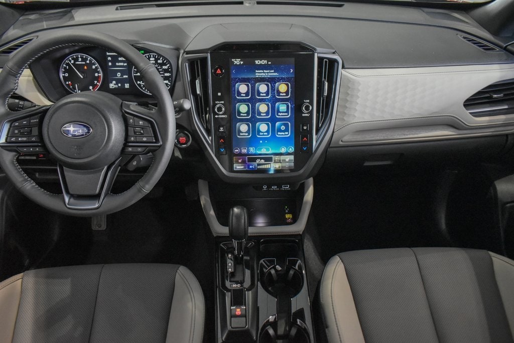 This Forester is well equipped with Standard Model, 4-Wheel Disc Brakes, 6 Speakers, ABS brakes, Air Conditioning, Alloy wheels, AM/FM radio: SiriusXM with 360L, Anti-whiplash front head restraints, Auto High-beam Headlights, Auto-Dimming Exterior Mirror with Approach Light, Auto-Dimming Mirror with Compass and HomeLink, Automatic temperature control, Brake assist, Bumpers: body-color, Cargo Net, Driver door bin, Driver vanity mirror, Dual front impact airbags, Dual front side impact airbags, Electronic Stability Control, Emergency communication system: MySubaru Companion (5-years free), Exterior Parking Camera Rear, Four wheel independent suspension, Front anti-roll bar, Front Bucket Seats, Front Center Armrest, Front dual zone A/C, Front fog lights, Front reading lights, Fully automatic headlights, Heated door mirrors, Heated Front Bucket Seats, Heated front seats, Illuminated entry, Knee airbag, Leather steering wheel, Low tire pressure warning, Occupant sensing airbag, Outside temperature display, Overhead airbag, Overhead console, Panic alarm, Passenger door bin, Passenger vanity mirror, Power door mirrors, Power driver seat, Power moonroof: Panoramic, Power steering, Power windows, Radio data system, Radio: Subaru 11.6" Multimedia Plus System, Rear anti-roll bar, Rear seat center armrest, Rear window defroster, Rear window wiper, Remote keyless entry, Security system, Speed control, Speed-sensing steering, Split folding rear seat, Spoiler, Sport StarTex Upholstery, Steering wheel mounted audio controls, Tachometer, Telescoping steering wheel, Tilt steering wheel, Traction control, Trip computer, Turn signal indicator mirrors, Variably intermittent wipers, and Wheels: 19" x 7.5 J Bronze Finish Aluminum-Alloy.