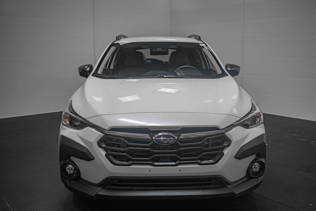 This Crosstrek is well equipped with 4-Wheel Disc Brakes, 6 Speakers, ABS brakes, Air Conditioning, Alloy wheels, Anti-whiplash front head restraints, Auto High-beam Headlights, Automatic temperature control, Brake assist, Bumpers: body-color, Cloth Upholstery, Driver door bin, Driver vanity mirror, Dual front impact airbags, Dual front side impact airbags, Electronic Stability Control, Emergency communication system: MySubaru Companion (5-years free), Exterior Parking Camera Rear, Four wheel independent suspension, Front anti-roll bar, Front Bucket Seats, Front Center Armrest, Front dual zone A/C, Front fog lights, Front reading lights, Fully automatic headlights, Illuminated entry, Knee airbag, Low tire pressure warning, Occupant sensing airbag, Outside temperature display, Overhead airbag, Overhead console, Panic alarm, Passenger door bin, Passenger vanity mirror, Power door mirrors, Power steering, Power windows, Radio data system, Radio: Subaru 11.6" Multimedia Plus System, Rear anti-roll bar, Rear seat center armrest, Rear side impact airbag, Rear window defroster, Rear window wiper, Remote keyless entry, Security system, Speed control, Speed-sensing steering, Split folding rear seat, Spoiler, Steering wheel mounted audio controls, Tachometer, Telescoping steering wheel, Tilt steering wheel, Traction control, Trip computer, Turn signal indicator mirrors, Variably intermittent wipers, and Wheels: 17" x 7.0" J Machine Finish Aluminum-Alloy.