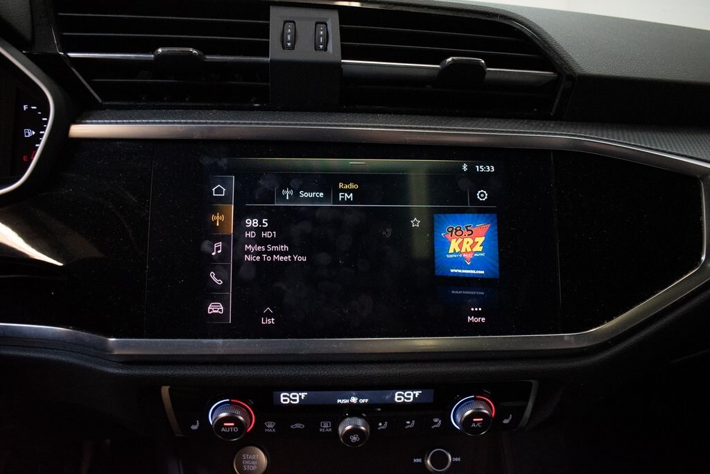 This Q3 is well equipped with Convenience Package (Alarm w/Motion Sensor, Audi Advanced Key, Audi Parking System Plus, Audi Side Assist, HomeLink Garage Door Opener, and SiriusXM All Access Service), Premium Plus Package (8-Way Power Driver & Passenger Seat, Aluminum Spectrum Inlays, Audi Phone Box w/Wireless Charging, Auto-Dimming Rear-View Mirror w/Compass, Full LED Headlights w/Unique DRL Signature, and LED Interior Lighting), 10 Speakers, 3.533 Axle Ratio, 4-Wheel Disc Brakes, ABS brakes, Air Conditioning, Alloy wheels, AM/FM radio, Audi smartphone interface (Apple CarPlay/Android Auto), Auto High-beam Headlights, Automatic temperature control, Brake assist, Bumpers: body-color, Delay-off headlights, Driver door bin, Driver vanity mirror, Dual front impact airbags, Dual front side impact airbags, Electronic Stability Control, Exterior Parking Camera Rear, Four wheel independent suspension, Front anti-roll bar, Front Bucket Seats, Front Center Armrest, Front dual zone A/C, Front fog lights, Front reading lights, Fully automatic headlights, Heated door mirrors, Heated Front Bucket Seats, Heated front seats, Illuminated entry, Knee airbag, Leather Seating Surfaces, Leather Shift Knob, Leather steering wheel, Low tire pressure warning, Occupant sensing airbag, Outside temperature display, Overhead airbag, Overhead console, Panic alarm, Passenger door bin, Passenger vanity mirror, Power door mirrors, Power driver seat, Power Liftgate, Power moonroof, Power steering, Power windows, Radio data system, Radio: Audi Sound System, Rain sensing wipers, Rear air conditioning, Rear anti-roll bar, Rear fog lights, Rear reading lights, Rear seat center armrest, Rear window defroster, Rear window wiper, Remote keyless entry, Speed control, Speed-sensing steering, Split folding rear seat, Spoiler, Steering wheel mounted audio controls, Tachometer, Telescoping steering wheel, Tilt steering wheel, Traction control, Trip computer, Turn signal indicator mirrors, Variably intermittent wipers, and Wheels: 19" 5-Twin-Spoke Dynamic Design.