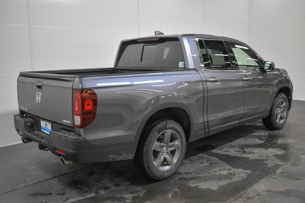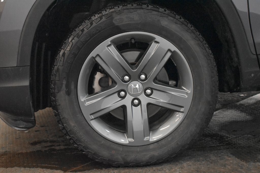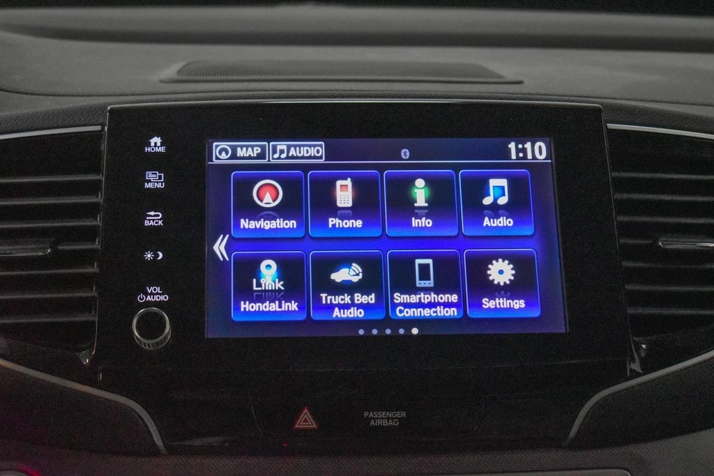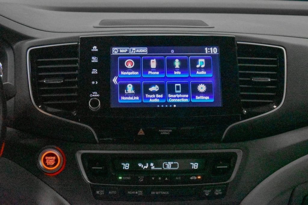 This Ridgeline is well equipped with Honda Satellite-Linked Navigation System, Navigation system: Honda Satellite-Linked Navigation System, 4-Wheel Disc Brakes, 4.33 Axle Ratio, 8 Speakers, ABS brakes, Air Conditioning, Alloy wheels, AM/FM radio: SiriusXM, Apple CarPlay/Android Auto, Auto High-beam Headlights, Auto-dimming Rear-View mirror, Automatic temperature control, Blind Spot Information (BSI) System warning, Bluetooth® Hands-Free Link, Brake assist, Bumpers: body-color, Compass, Delay-off headlights, Driver door bin, Driver vanity mirror, Driver's Seat Mounted Armrest, Dual front impact airbags, Dual front side impact airbags, Electronic Stability Control, Exterior Parking Camera Rear, Four wheel independent suspension, Front anti-roll bar, Front Bucket Seats, Front dual zone A/C, Front fog lights, Front reading lights, Fully automatic headlights, Garage door transmitter: HomeLink, Heated door mirrors, Heated Front Bucket Seats, Heated front seats, Heated steering wheel, Illuminated entry, Leather Seat Trim, Low tire pressure warning, Memory seat, Occupant sensing airbag, Outside temperature display, Overhead airbag, Overhead console, Panic alarm, Passenger door bin, Passenger seat mounted armrest, Passenger vanity mirror, Power door mirrors, Power driver seat, Power moonroof, Power passenger seat, Power steering, Power windows, Radio data system, Radio: 540-Watt Premium Audio System w/8 Speakers, Rear air conditioning, Rear anti-roll bar, Rear reading lights, Rear seat center armrest, Rear step bumper, Rear window defroster, Remote keyless entry, Security system, SiriusXM, Speed control, Speed-sensing steering, Split folding rear seat, Steering wheel mounted audio controls, Tachometer, Telescoping steering wheel, Tilt steering wheel, Traction control, Trip computer, Turn signal indicator mirrors, Variably intermittent wipers, and Wheels: 18" Exclusive Pewter Gray Alloy.