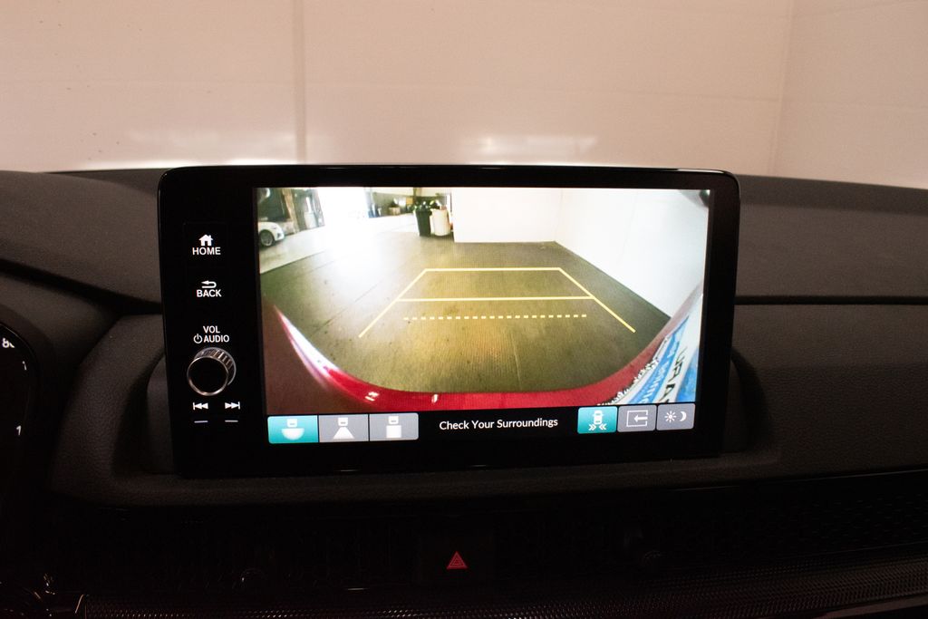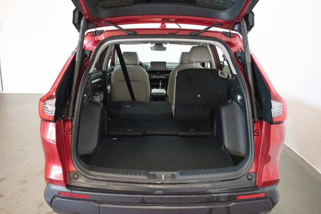This CR-V is well equipped with 4-Wheel Disc Brakes, 5.64 Axle Ratio, 8 Speakers, ABS brakes, Adaptive Cruise Control: Adaptive Cruise Control (ACC) with Low-Speed Follow, Air Conditioning, Alloy wheels, AM/FM radio: SiriusXM, Auto High-beam Headlights, Auto-dimming Rear-View mirror, Automatic temperature control, Blind Spot Information (BSI) System warning, Brake assist, Bumpers: body-color, Compass, Delay-off headlights, Driver door bin, Driver vanity mirror, Dual front impact airbags, Dual front side impact airbags, Electronic Stability Control, Exterior Parking Camera Rear, Four wheel independent suspension, Front anti-roll bar, Front Bucket Seats, Front Center Armrest, Front dual zone A/C, Front reading lights, Fully automatic headlights, Heated door mirrors, Heated Front Bucket Seats, Heated front seats, Illuminated entry, Knee airbag, Leather Seat Trim, Leather Shift Knob, Leather steering wheel, Low tire pressure warning, Memory seat, Occupant sensing airbag, Outside temperature display, Overhead airbag, Overhead console, Panic alarm, Passenger door bin, Passenger vanity mirror, Power door mirrors, Power driver seat, Power Liftgate, Power moonroof, Power passenger seat, Power steering, Power windows, Radio data system, Radio: 320-Watt AM/FM/HD/SiriusXM Audio System, Rear anti-roll bar, Rear reading lights, Rear seat center armrest, Rear side impact airbag, Rear window defroster, Rear window wiper, Remote keyless entry, Security system, Speed control, Speed-sensing steering, Speed-Sensitive Wipers, Split folding rear seat, Spoiler, Steering wheel mounted audio controls, Tachometer, Telescoping steering wheel, Tilt steering wheel, Traction control, Trip computer, Turn signal indicator mirrors, Variably intermittent wipers, Wheels: 18" Sparkle Silver Metallic, and Wireless Apple CarPlay/Wireless Android Auto.