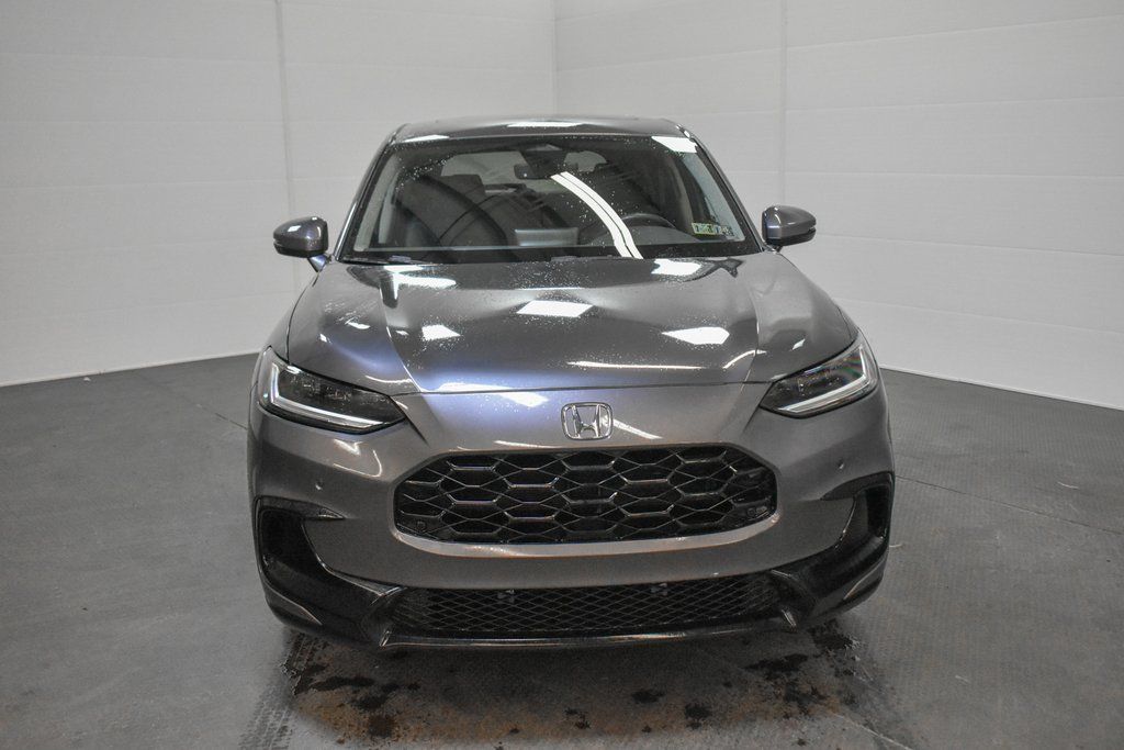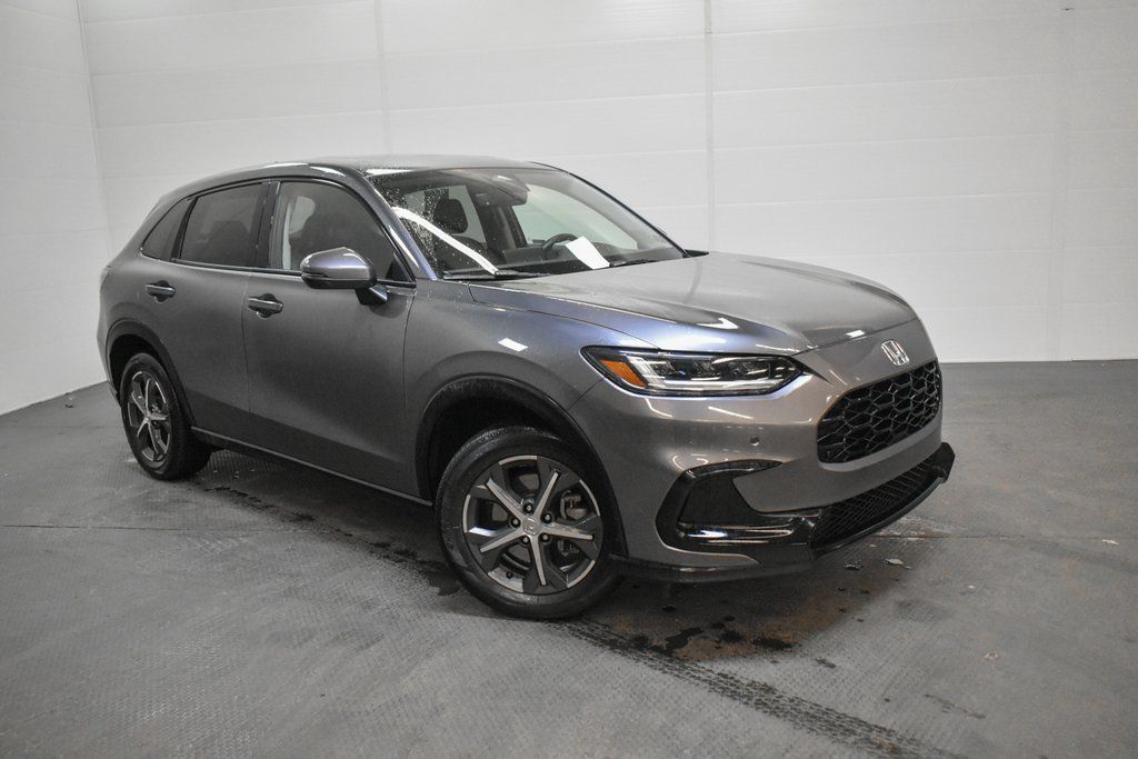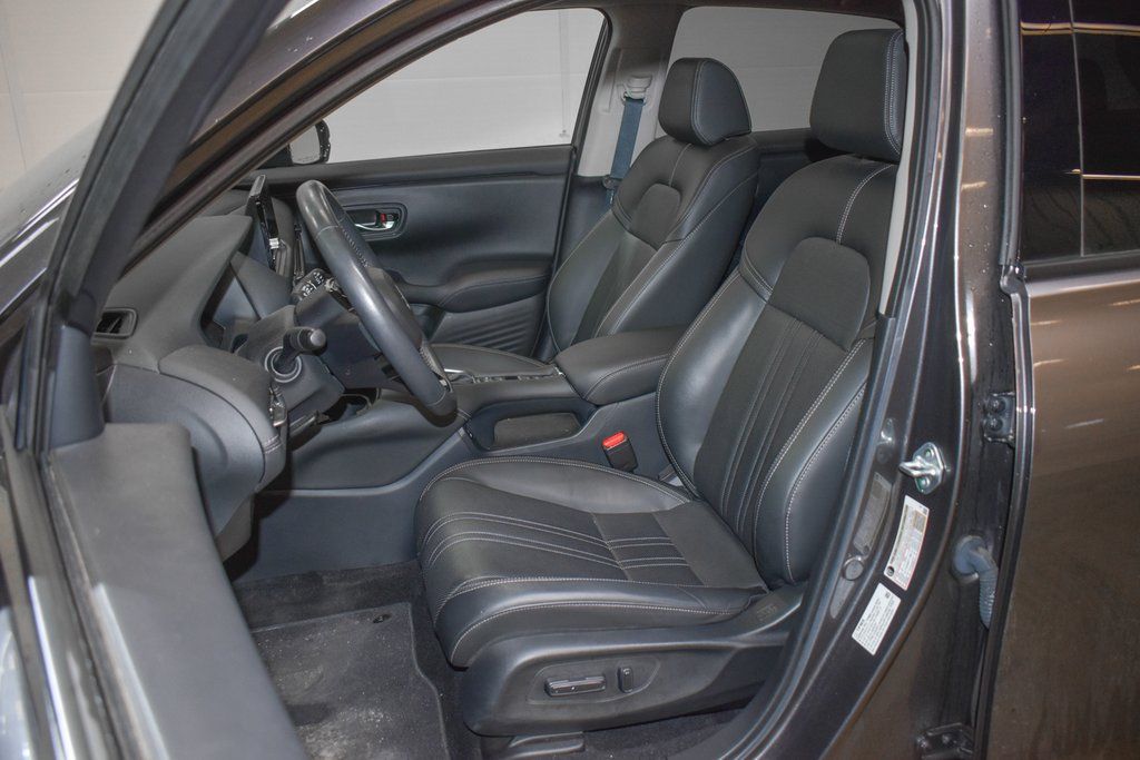 This HR-V is well equipped with 17" Machine-Finished Alloy Wheels, 4-Wheel Disc Brakes, 5.436 Axle Ratio, 8 Speakers, ABS brakes, Adaptive Cruise Control: Adaptive Cruise Control (ACC) with Low-Speed Follow, Air Conditioning, Alloy wheels, AM/FM radio: SiriusXM, Apple CarPlay/Android Auto, Auto High-beam Headlights, Auto-dimming Rear-View mirror, Automatic temperature control, Blind Spot Information (BSI) System warning, Brake assist, Bumpers: body-color, Compass, Delay-off headlights, Driver door bin, Driver vanity mirror, Dual front impact airbags, Dual front side impact airbags, Electronic Stability Control, Emergency communication system: HondaLink, Exterior Parking Camera Rear, Four wheel independent suspension, Front anti-roll bar, Front Bucket Seats, Front Center Armrest, Front dual zone A/C, Front reading lights, Fully automatic headlights, Heated door mirrors, Heated Front Bucket Seats, Heated front seats, Illuminated entry, Knee airbag, Leather Shift Knob, Leather steering wheel, Leather-Trimmed Seats, Low tire pressure warning, Occupant sensing airbag, Outside temperature display, Overhead airbag, Panic alarm, Passenger door bin, Passenger vanity mirror, Power door mirrors, Power driver seat, Power moonroof, Power steering, Power windows, Radio data system, Radio: 180-Watt Audio System w/8 Speakers, Rear anti-roll bar, Rear reading lights, Rear side impact airbag, Rear window defroster, Rear window wiper, Remote keyless entry, Security system, Speed control, Speed-sensing steering, Split folding rear seat, Spoiler, Steering wheel mounted audio controls, Tachometer, Telescoping steering wheel, Tilt steering wheel, Traction control, Trip computer, Turn signal indicator mirrors, and Variably intermittent wipers.