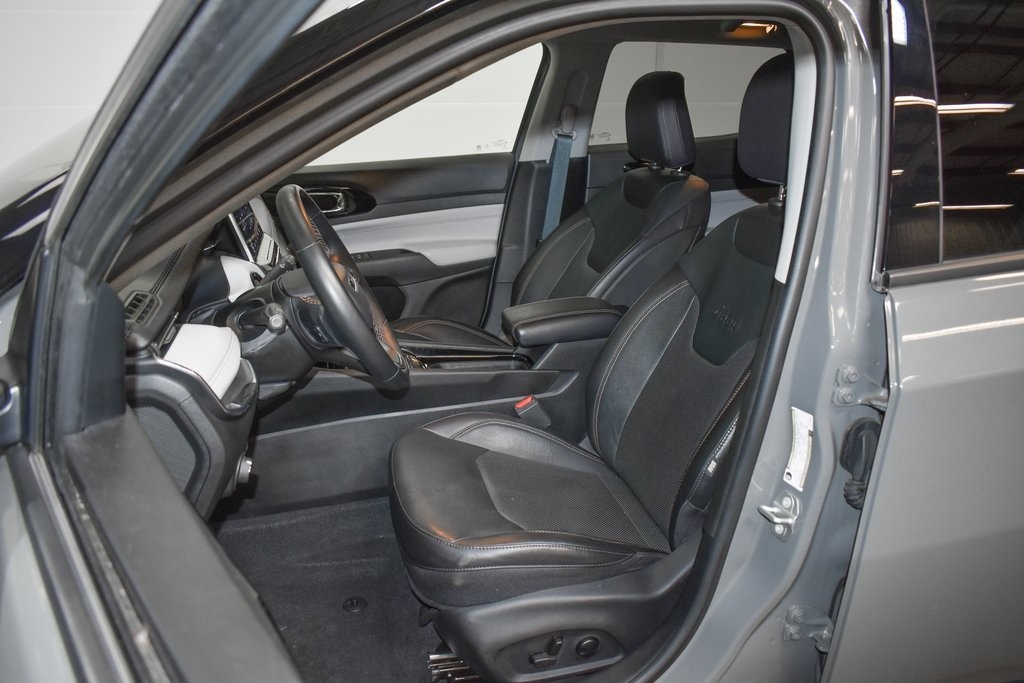 This Compass is well equipped with Quick Order Package 2GG, 10.1" Touchscreen Display, 3.73 Axle Ratio, 4-Wheel Disc Brakes, 6 Speakers, ABS brakes, Air Conditioning, Alloy wheels, AM/FM radio: SiriusXM, Anti-whiplash front head restraints, Auto High-beam Headlights, Auto-dimming Rear-View mirror, Automatic temperature control, Brake assist, Bumpers: body-color, Compass, Delay-off headlights, Disassociated Touchscreen Display, Driver door bin, Driver vanity mirror, Dual front impact airbags, Dual front side impact airbags, Electronic Stability Control, Emergency communication system: SiriusXM Guardian, Four wheel independent suspension, Front anti-roll bar, Front Bucket Seats, Front Center Armrest w/Storage, Front dual zone A/C, Front fog lights, Front License Plate Bracket, Front reading lights, Fully automatic headlights, Global Telematics Box Module (TBM), Gloss Black Exterior Mirrors, Heated door mirrors, Heated front seats, Heated steering wheel, Illuminated entry, Knee airbag, Leather Shift Knob, Leather Trimmed Bucket Seats, Low tire pressure warning, Occupant sensing airbag, Outside temperature display, Overhead airbag, Overhead console, Panic alarm, ParkView Rear Back-Up Camera, Passenger door bin, Passenger vanity mirror, Power door mirrors, Power driver seat, Power steering, Power windows, Radio: Uconnect 5 w/10.1" Display, Rain sensing wipers, Rear anti-roll bar, Rear seat center armrest, Rear window defroster, Rear window wiper, Remote keyless entry, Roof rack: rails only, Security system, Speed control, Split folding rear seat, Spoiler, Steering wheel mounted audio controls, Tachometer, Telescoping steering wheel, Tilt steering wheel, Traction control, Trip computer, Turn signal indicator mirrors, Variably intermittent wipers, and Wheels: 18" x 7" Painted Diamond Cut Aluminum.