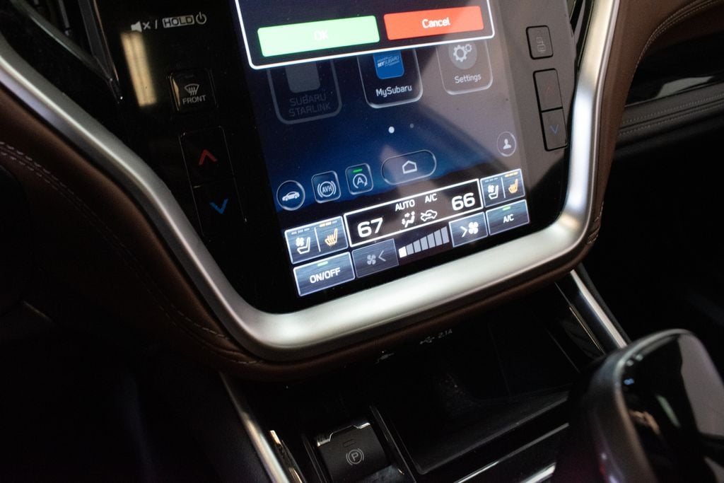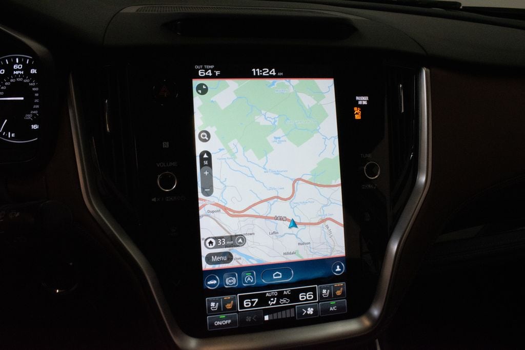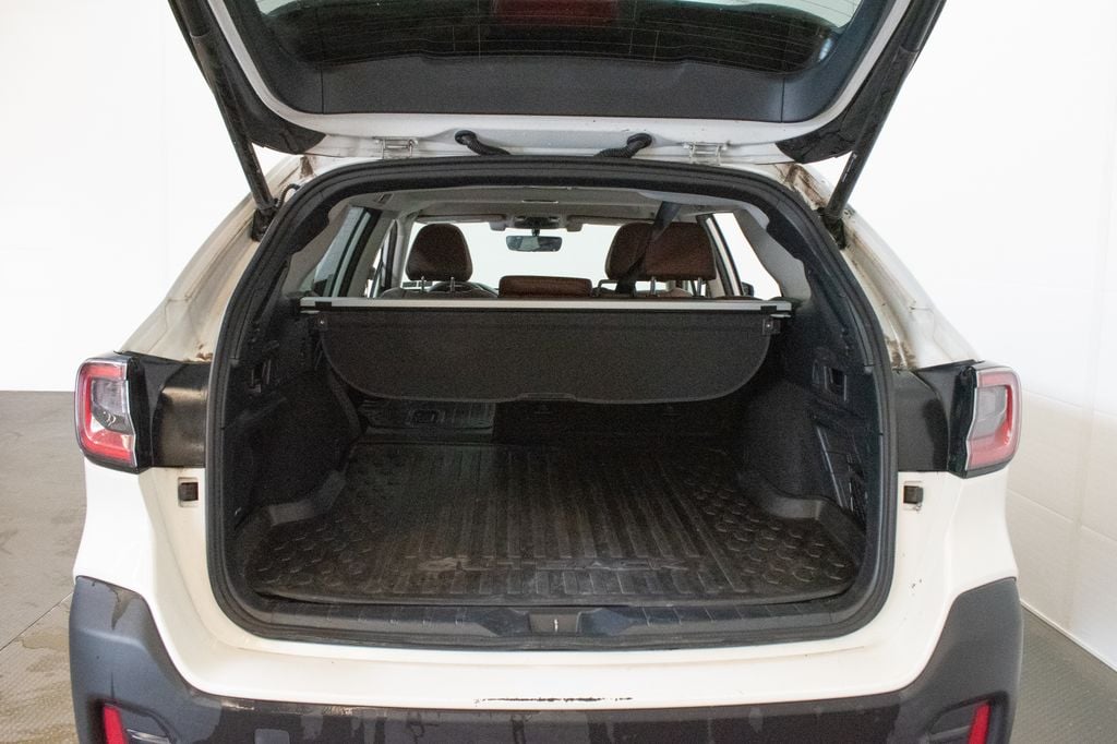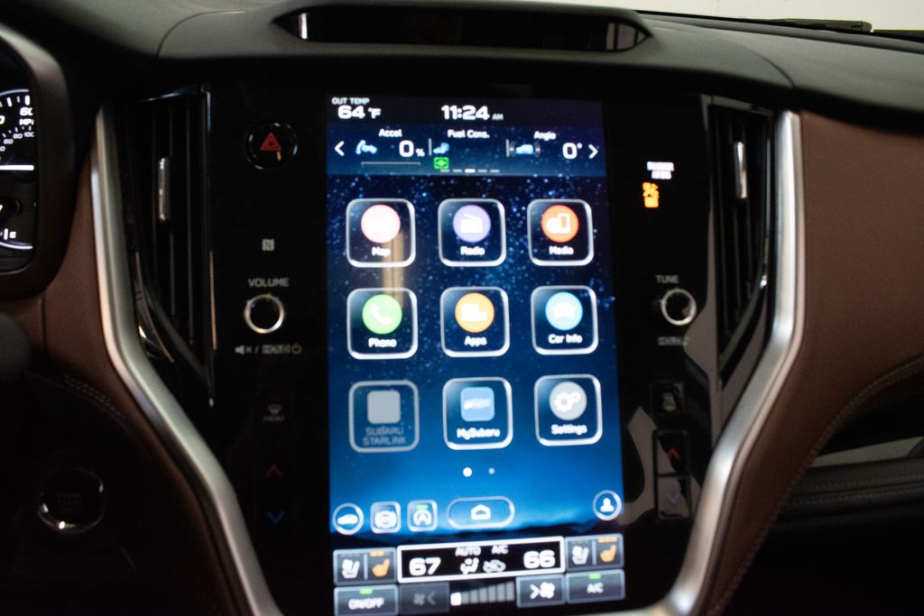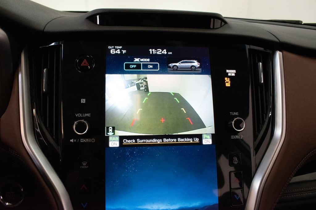 This Outback is well equipped with Standard Model, Navigation System, 12 Speakers, 4-Wheel Disc Brakes, 4.111 Axle Ratio, ABS brakes, Air Conditioning, All-Weather Floor Liners, Alloy wheels, AM/FM radio: SiriusXM, Auto High-beam Headlights, Auto-dimming Rear-View mirror, Automatic temperature control, Brake assist, Bumpers: body-color, Compass, Driver door bin, Driver vanity mirror, Dual front impact airbags, Dual front side impact airbags, Electronic Stability Control, Emergency communication system: STARLINK Safety and Security (Subscription Required), Exterior Parking Camera Rear, Four wheel independent suspension, Front anti-roll bar, Front Bucket Seats, Front Center Armrest w/Storage, Front dual zone A/C, Front fog lights, Front reading lights, Fully automatic headlights, Garage door transmitter: HomeLink, harman/kardon® Speakers, Heated & Ventilated Front Bucket Seats, Heated door mirrors, Heated front seats, Heated rear seats, Heated steering wheel, HVAC memory, Illuminated entry, Knee airbag, Leather steering wheel, Low tire pressure warning, Memory seat, Occupant sensing airbag, Outside temperature display, Overhead airbag, Overhead console, Panic alarm, Passenger door bin, Passenger vanity mirror, Perforated Nappa Leather-Trimmed Upholstery, Power door mirrors, Power driver seat, Power Liftgate, Power moonroof, Power passenger seat, Power steering, Power windows, Radio: Subaru STARLINK 11.6" Multimedia Nav System, Rear anti-roll bar, Rear Seat Back Protector, Rear seat center armrest, Rear window defroster, Rear window wiper, Remote CD player, Remote keyless entry, Roof rack, Security system, Speed control, Speed-sensing steering, Split folding rear seat, Spoiler, STARLINK/Apple CarPlay/Android Auto, Steering wheel mounted audio controls, Steering Wheel Paddle Shift Control Switches, Tachometer, Telescoping steering wheel, Tilt steering wheel, Traction control, Trip computer, Turn signal indicator mirrors, Variably intermittent wipers, Ventilated front seats, and Wheels: 18" x 7J Black Aluminum Alloy.