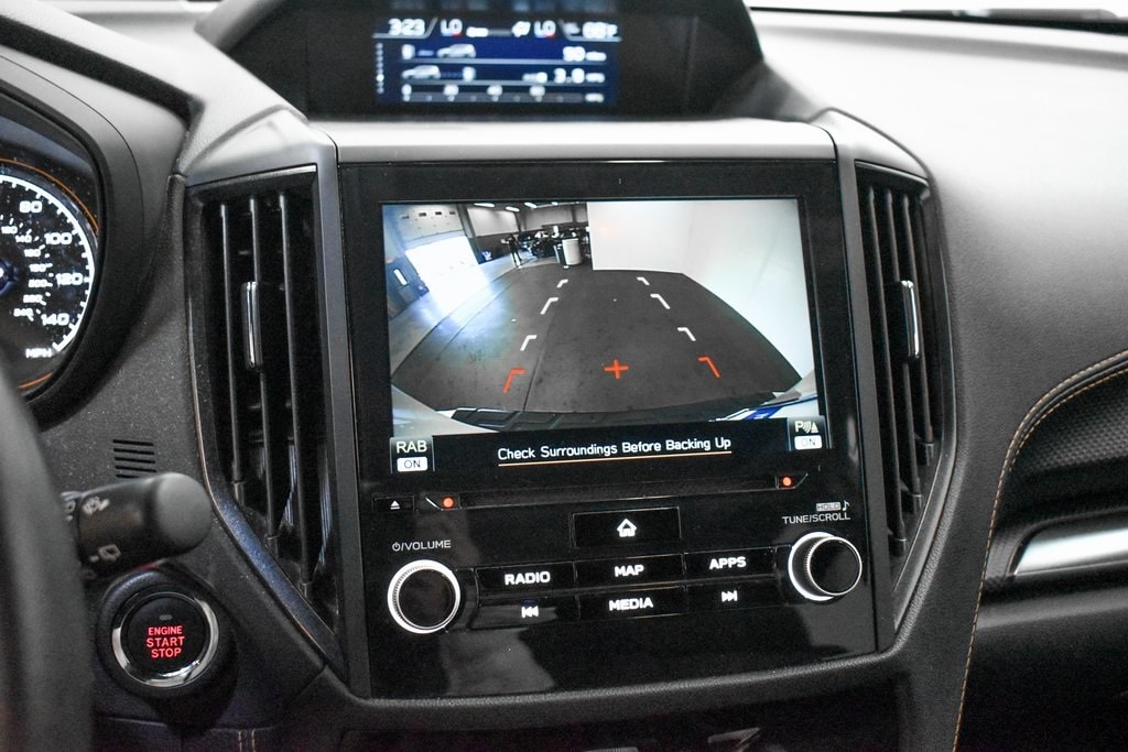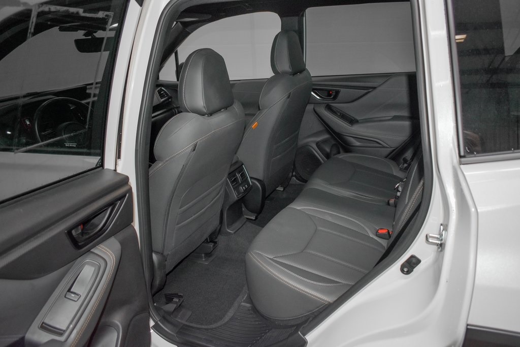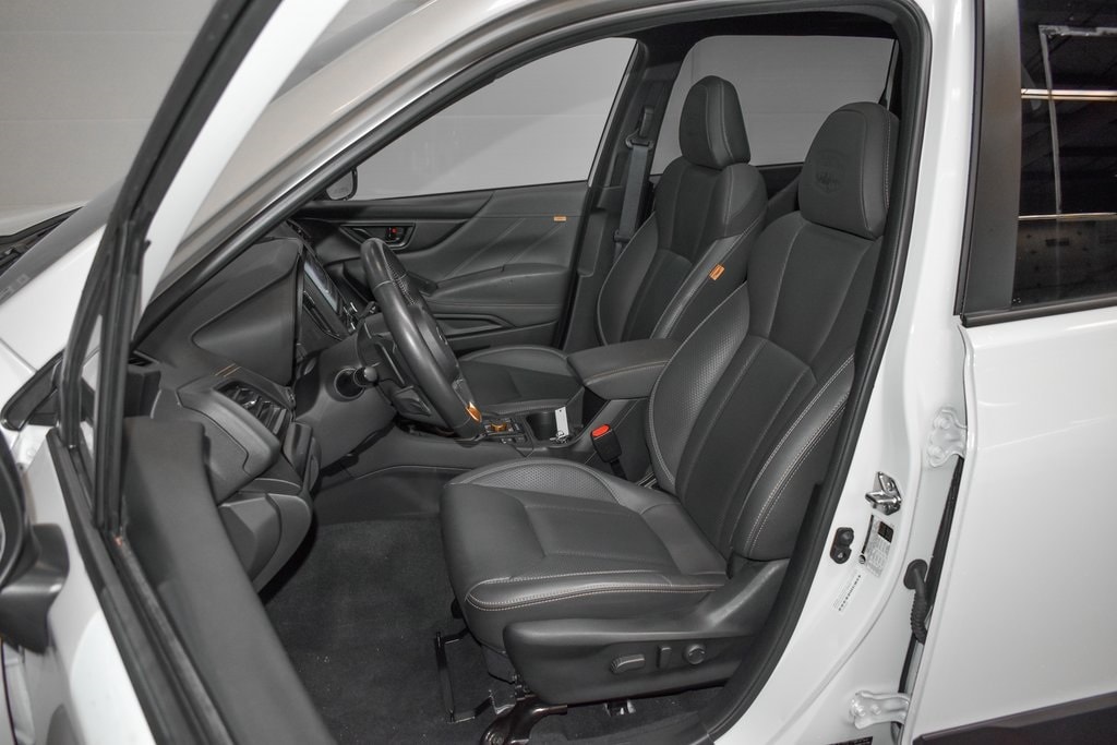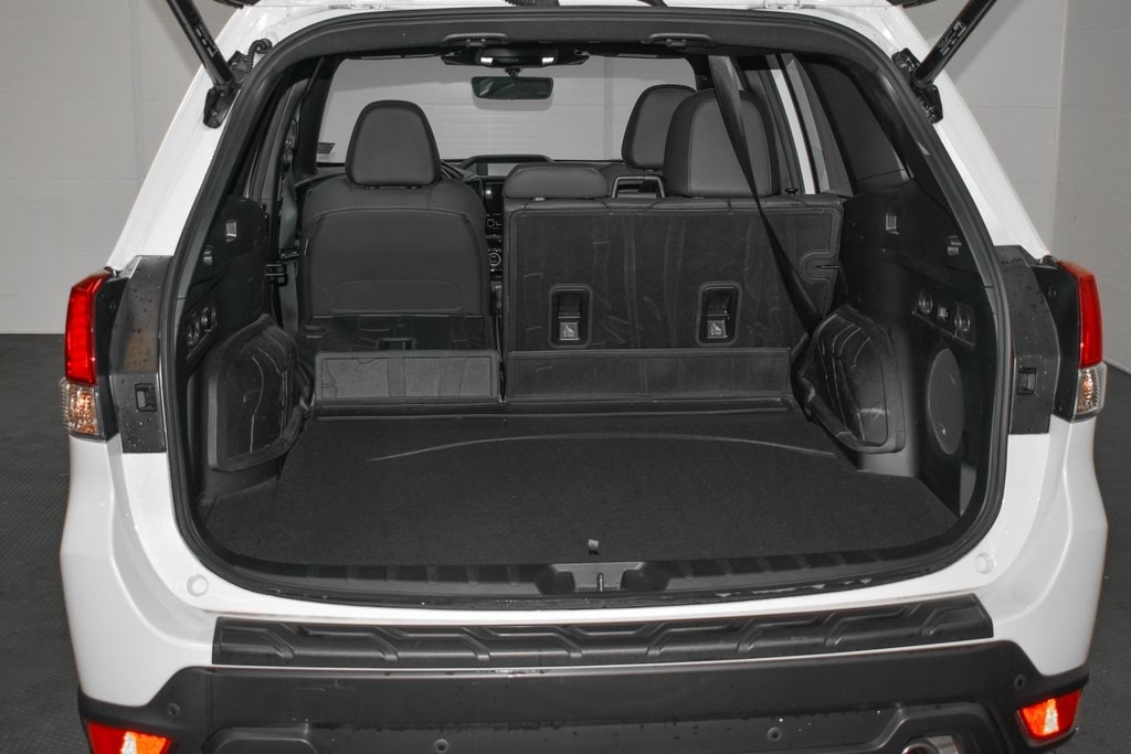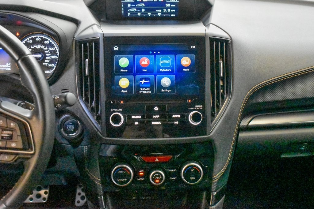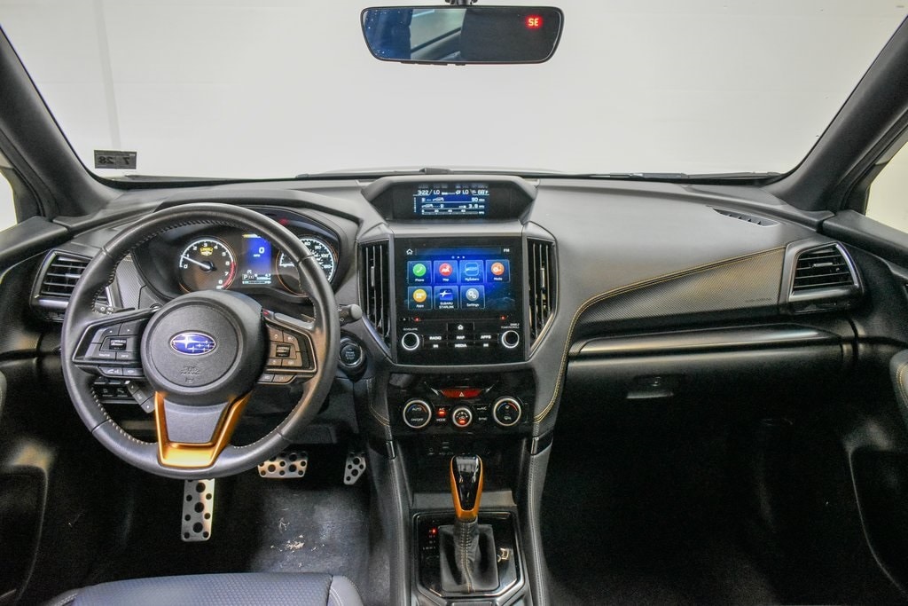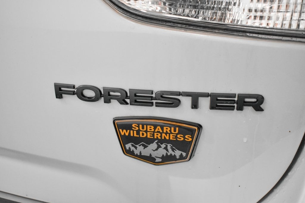 This Forester is well equipped with 8" Audio w/harman/kardon & Power Rear Gate (harman/kardon 9-Speaker Audio System, Power Rear Gate, and Radio: Subaru Starlink 8.0" Multimedia Nav System), Navigation System, 4-Wheel Disc Brakes, 4.11 Axle Ratio, 6 Speakers, ABS brakes, Air Conditioning, Alloy wheels, AM/FM radio: SiriusXM, Anti-whiplash front head restraints, Auto High-beam Headlights, Auto-Dimming Exterior Mirror w/Approach Light, Auto-Dimming Mirror w/Compass & HomeLink, Automatic temperature control, Brake assist, Bumpers: body-color, Cargo Sidewall Protector, CD player, Driver door bin, Driver vanity mirror, Dual front impact airbags, Dual front side impact airbags, Electronic Stability Control, Emergency communication system: STARLINK Safety and Security (Subscription Required), Exterior Parking Camera Rear, Four wheel independent suspension, Front anti-roll bar, Front Bucket Seats, Front Center Armrest, Front dual zone A/C, Front fog lights, Front reading lights, Fully automatic headlights, Heated door mirrors, Heated Front Bucket Seats, Heated front seats, Illuminated entry, Knee airbag, Leather Shift Knob, Low tire pressure warning, Occupant sensing airbag, Outside temperature display, Overhead airbag, Overhead console, Panic alarm, Passenger door bin, Passenger vanity mirror, Power door mirrors, Power driver seat, Power moonroof: Panoramic, Power steering, Power windows, Radio data system, Radio: Subaru Starlink 8.0" Multimedia Plus System, Rear anti-roll bar, Rear Bumper Cover, Rear seat center armrest, Rear Seatback Protector - Wilderness, Rear window defroster, Rear window wiper, Remote keyless entry, Roof rack: rails only, Security system, Speed control, Speed-sensing steering, Splash Guards - Wilderness, Split folding rear seat, Spoiler, STARLINK/Apple CarPlay/Android Auto, Steering wheel mounted audio controls, Tachometer, Telescoping steering wheel, Textured StarTex Upholstery, Tilt steering wheel, Traction control, Trip computer, Turn signal indicator mirrors, Variably intermittent wipers, and Wheels: 17" x 7.0 J Matte Black Finish Alum-Alloy.