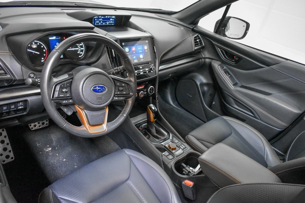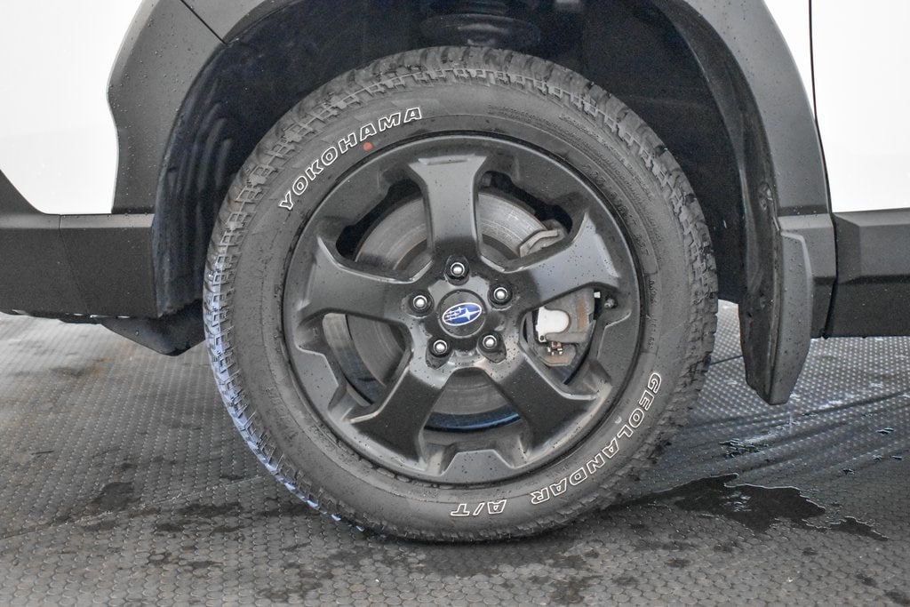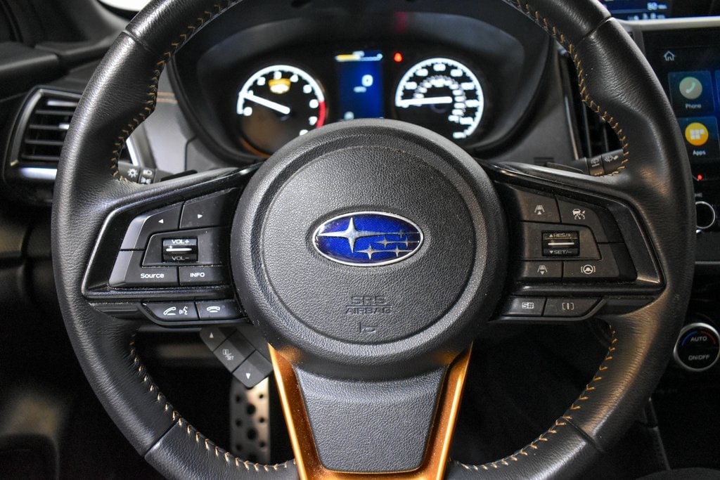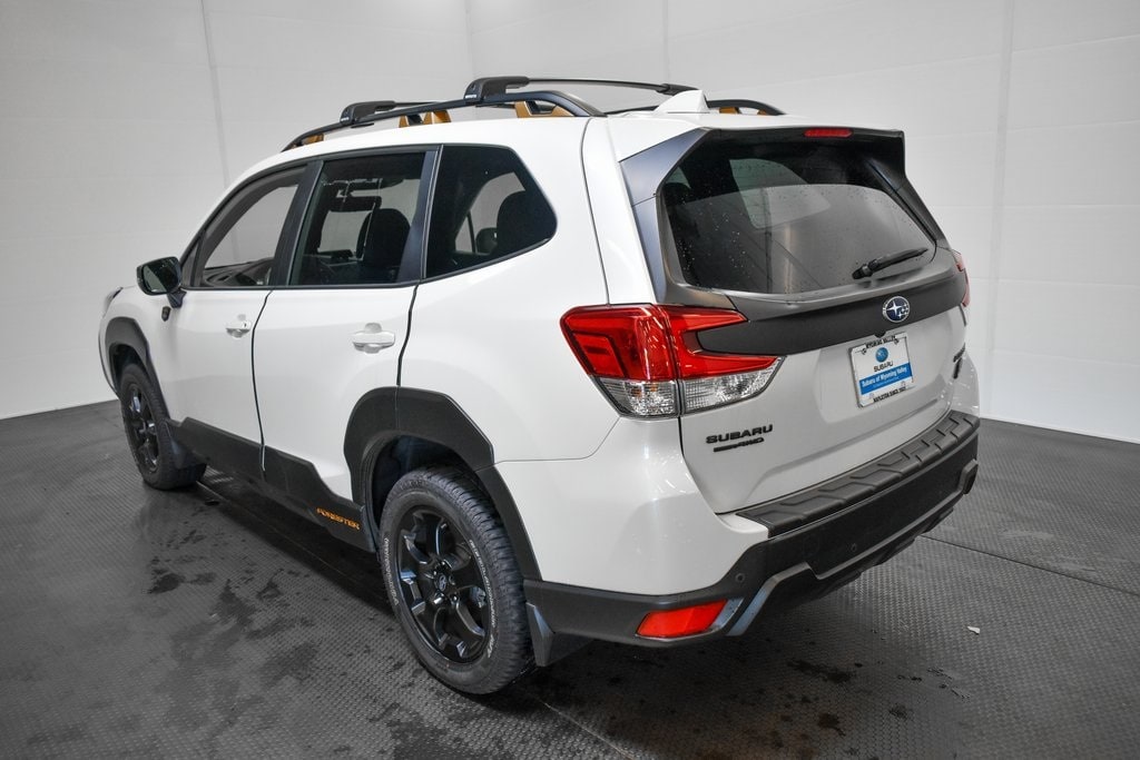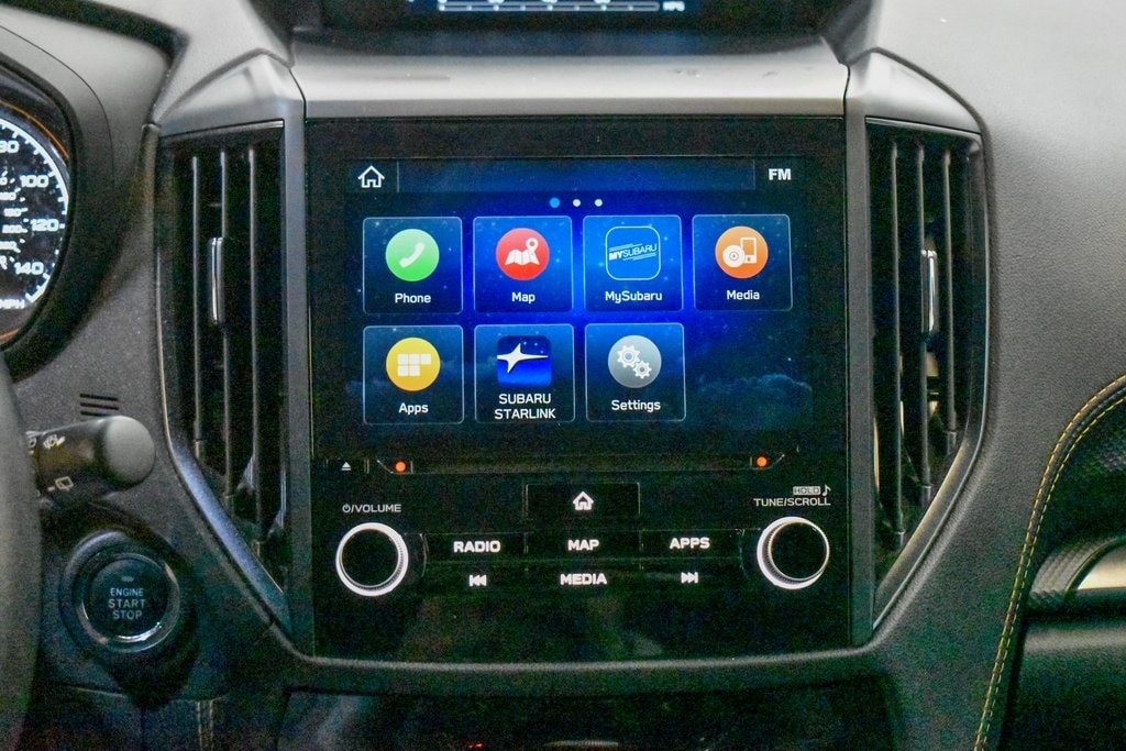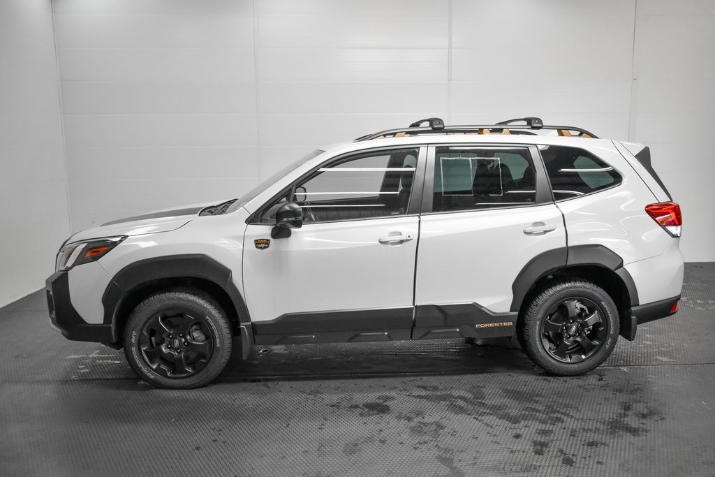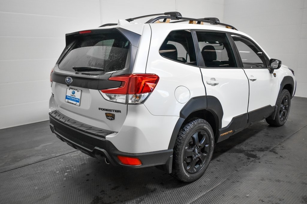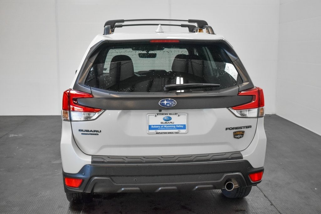This Forester is well equipped with 8" Audio w/harman/kardon & Power Rear Gate (harman/kardon 9-Speaker Audio System, Power Rear Gate, and Radio: Subaru Starlink 8.0" Multimedia Nav System), Navigation System, 4-Wheel Disc Brakes, 4.11 Axle Ratio, 6 Speakers, ABS brakes, Air Conditioning, Alloy wheels, AM/FM radio: SiriusXM, Anti-whiplash front head restraints, Auto High-beam Headlights, Auto-Dimming Exterior Mirror w/Approach Light, Auto-Dimming Mirror w/Compass & HomeLink, Automatic temperature control, Brake assist, Bumpers: body-color, Cargo Sidewall Protector, CD player, Driver door bin, Driver vanity mirror, Dual front impact airbags, Dual front side impact airbags, Electronic Stability Control, Emergency communication system: STARLINK Safety and Security (Subscription Required), Exterior Parking Camera Rear, Four wheel independent suspension, Front anti-roll bar, Front Bucket Seats, Front Center Armrest, Front dual zone A/C, Front fog lights, Front reading lights, Fully automatic headlights, Heated door mirrors, Heated Front Bucket Seats, Heated front seats, Illuminated entry, Knee airbag, Leather Shift Knob, Low tire pressure warning, Occupant sensing airbag, Outside temperature display, Overhead airbag, Overhead console, Panic alarm, Passenger door bin, Passenger vanity mirror, Power door mirrors, Power driver seat, Power moonroof: Panoramic, Power steering, Power windows, Radio data system, Radio: Subaru Starlink 8.0" Multimedia Plus System, Rear anti-roll bar, Rear Bumper Cover, Rear seat center armrest, Rear Seatback Protector - Wilderness, Rear window defroster, Rear window wiper, Remote keyless entry, Roof rack: rails only, Security system, Speed control, Speed-sensing steering, Splash Guards - Wilderness, Split folding rear seat, Spoiler, STARLINK/Apple CarPlay/Android Auto, Steering wheel mounted audio controls, Tachometer, Telescoping steering wheel, Textured StarTex Upholstery, Tilt steering wheel, Traction control, Trip computer, Turn signal indicator mirrors, Variably intermittent wipers, and Wheels: 17" x 7.0 J Matte Black Finish Alum-Alloy.