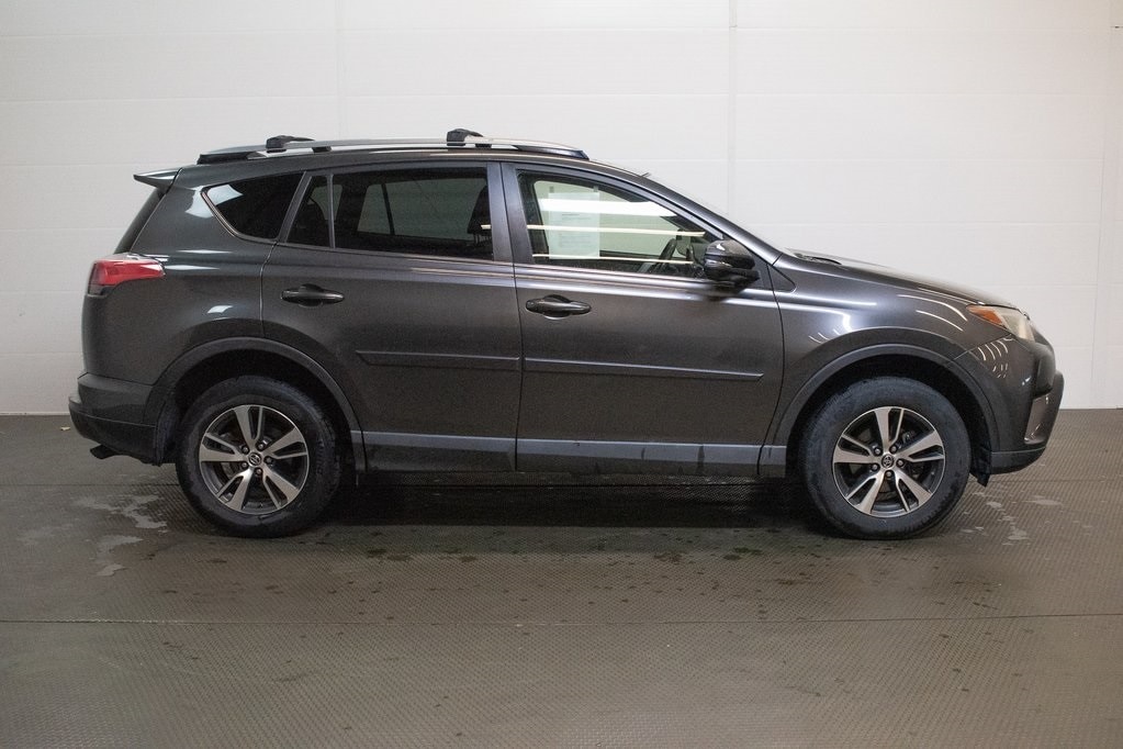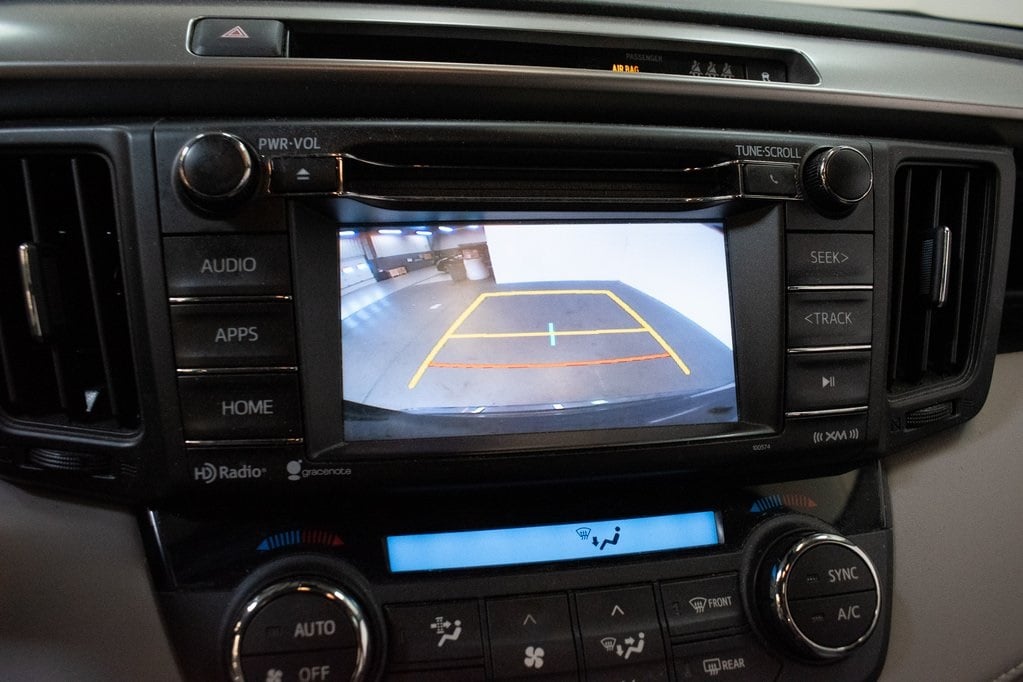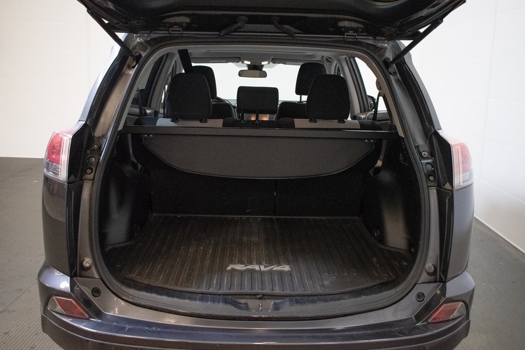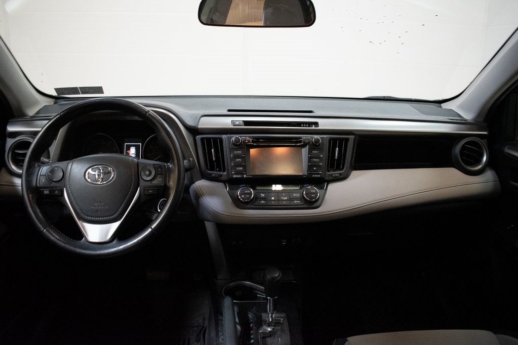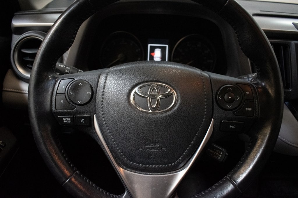 This RAV4 is well equipped with 4-Wheel Disc Brakes, 4.071 Axle Ratio, 6 Speakers, ABS brakes, Air Conditioning, Alloy wheels, AM/FM radio, Auto High-beam Headlights, Automatic temperature control, Brake assist, Bumpers: body-color, CD player, Driver door bin, Driver vanity mirror, Dual front impact airbags, Dual front side impact airbags, Electronic Stability Control, Exterior Parking Camera Rear, Fabric Seat Trim, Four wheel independent suspension, Front anti-roll bar, Front Bucket Seats, Front Center Armrest, Front dual zone A/C, Front fog lights, Front reading lights, Front Sport Seats, Fully automatic headlights, Heated door mirrors, Illuminated entry, Knee airbag, Leather steering wheel, Low tire pressure warning, Occupant sensing airbag, Outside temperature display, Overhead airbag, Overhead console, Panic alarm, Passenger door bin, Passenger vanity mirror, Power door mirrors, Power moonroof, Power steering, Power windows, Radio data system, Radio: Entune AM/FM/CD/MP3/WMA Playback w/6 Speakers, Radio: Entune Audio Plus AM/FM/MP3/WMA Playback, Rear anti-roll bar, Rear seat center armrest, Rear window defroster, Rear window wiper, Remote keyless entry, Speed control, Speed-sensing steering, Split folding rear seat, Spoiler, Steering wheel mounted audio controls, Tachometer, Telescoping steering wheel, Tilt steering wheel, Traction control, Trip computer, Turn signal indicator mirrors, Variably intermittent wipers, and Wheels: 17" x 7.0J 5-Spoke Superchrome Alloy.