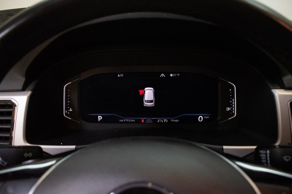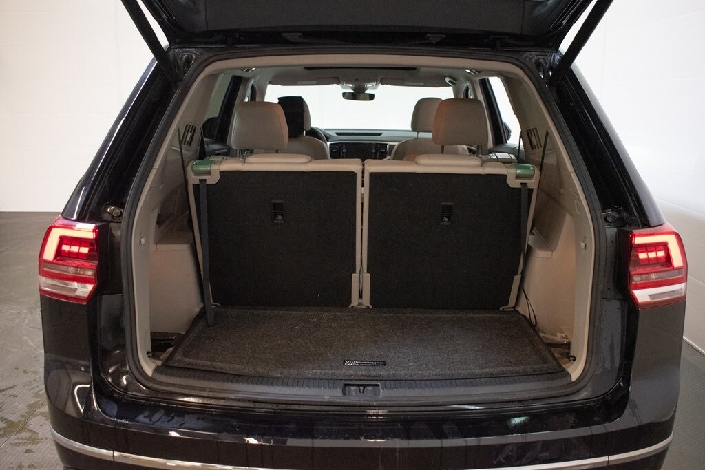This Atlas is well equipped with Navigation System, 20" Twin 5-Spoke Alloy Wheels, 3.60 Axle Ratio, 3rd row seats: split-bench, 4-Wheel Disc Brakes, 8 Speakers, ABS brakes, Active Blind Spot Monitor, Air Conditioning, Alloy wheels, AM/FM radio: SiriusXM, Auto-dimming Rear-View mirror, Automatic temperature control, Brake assist, Bumpers: body-color, Compass, Delay-off headlights, Driver door bin, Driver vanity mirror, Dual front impact airbags, Dual front side impact airbags, Electronic Stability Control, Emergency communication system: VW Car-Net services (capabilities require enrollment or subscription), Exterior Parking Camera Rear, Forward collision: FCW w/Autonomous Emergency Braking mitigation, Four wheel independent suspension, Front anti-roll bar, Front Bucket Seats, Front Center Armrest, Front dual zone A/C, Front fog lights, Front reading lights, Garage door transmitter: HomeLink, Heated Comfort Front Bucket Seats, Heated door mirrors, Heated front seats, Heated steering wheel, Illuminated entry, Low tire pressure warning, Memory seat, Occupant sensing airbag, Outside temperature display, Overhead airbag, Overhead console, Panic alarm, Passenger door bin, Passenger vanity mirror, Power door mirrors, Power driver seat, Power Liftgate, Power moonroof, Power passenger seat, Power steering, Power windows, Radio data system, Radio: Discover Media 8.0" Touchscreen w/Nav, Rain sensing wipers, Rear air conditioning, Rear anti-roll bar, Rear reading lights, Rear seat center armrest, Rear window defroster, Rear window wiper, Remote CD player, Remote keyless entry, Roof rack: rails only, Security system, Speed control, Speed-sensing steering, Split folding rear seat, Spoiler, Standard Suspension, Steering wheel mounted audio controls, Tachometer, Telescoping steering wheel, Tilt steering wheel, Traction control, Trip computer, Turn signal indicator mirrors, V-Tex Leatherette Seating Surfaces, and Variably intermittent wipers.